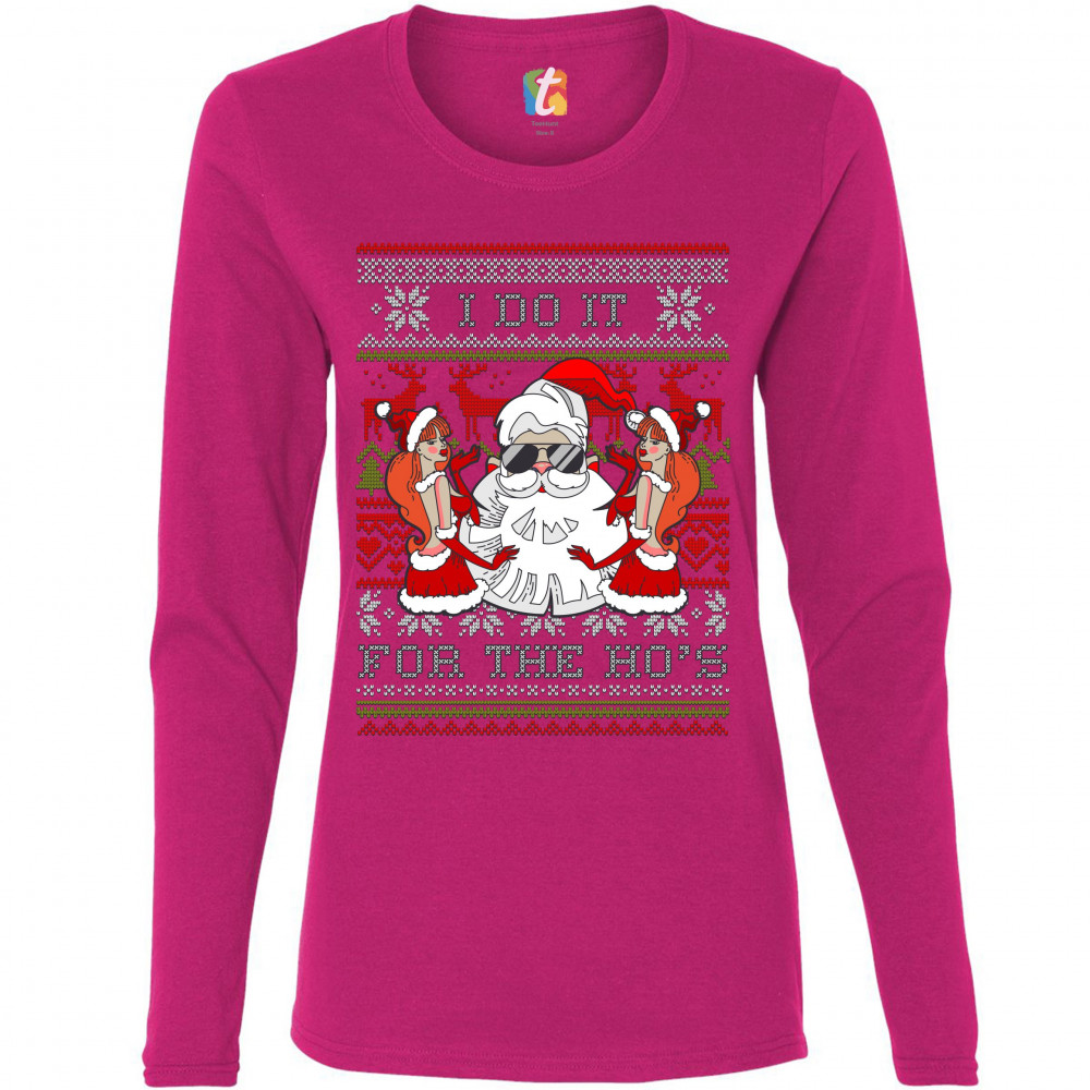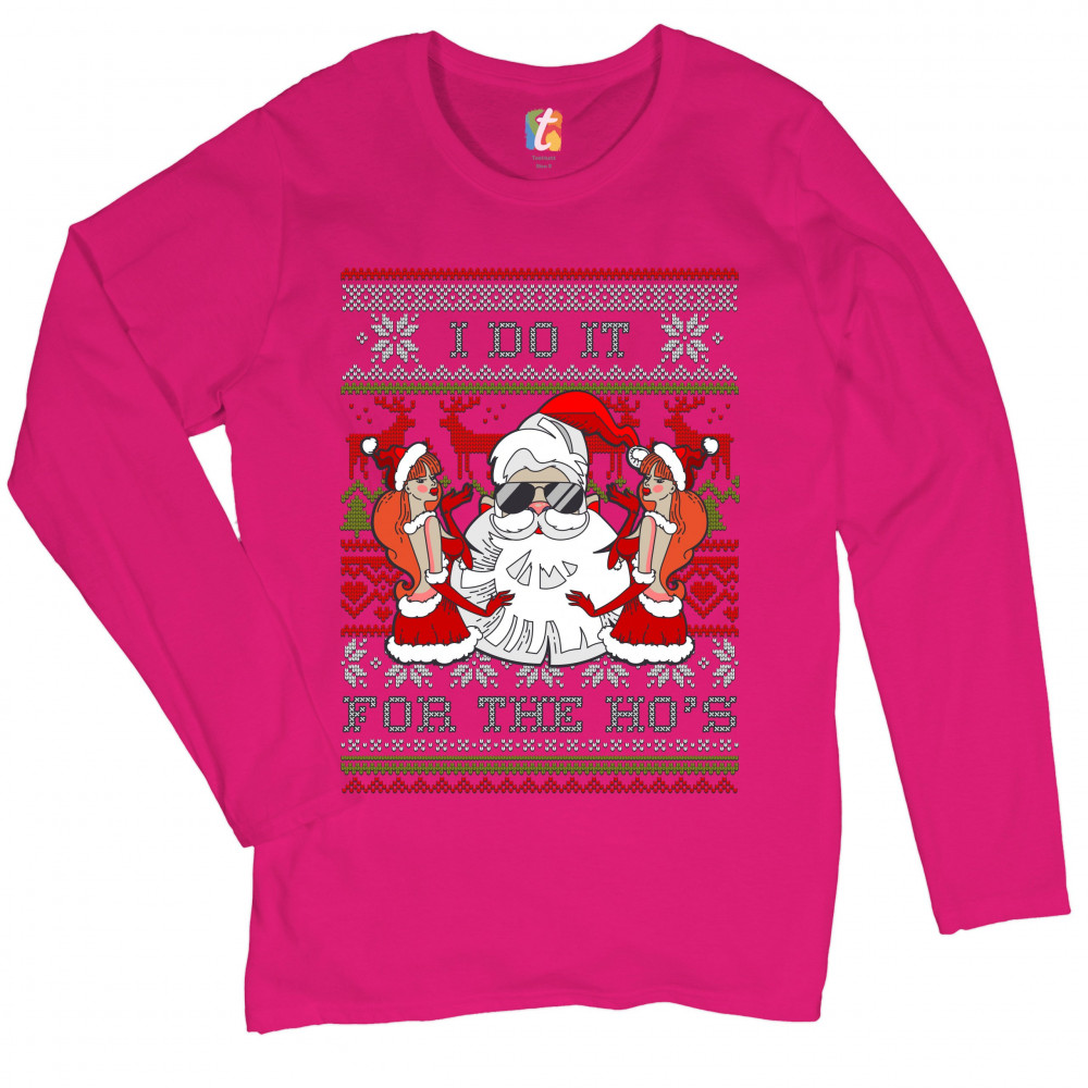 A funny print saying: "I do it for the ho's". It features a badass Santa Claus wearing sunglasses and two sexy girls in revealing Christmas outfits leaning on Santa's beard. The print is decorated wit the ugly sweater pattern in the background. Amazing ch
