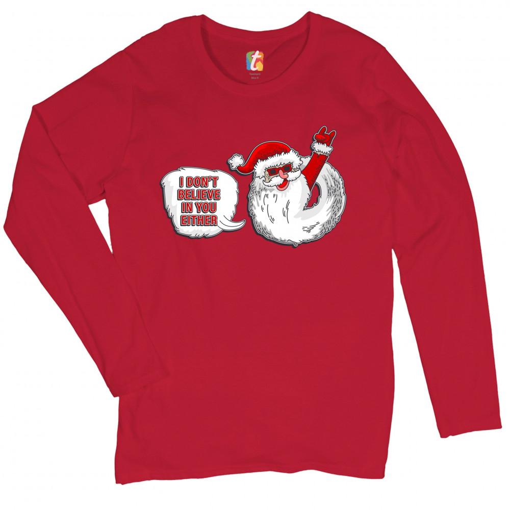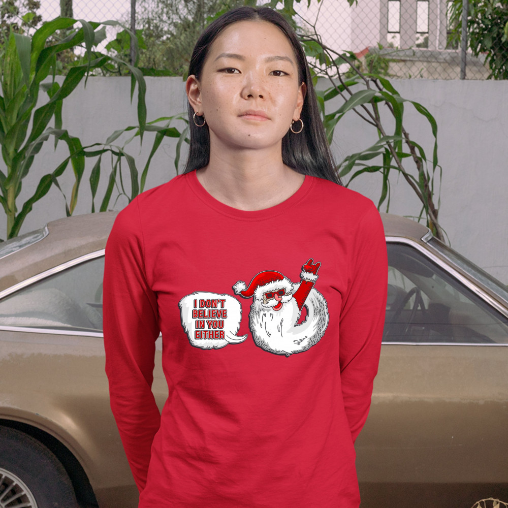 I DON'T BELIEVE IN YOU EITHER women's long sleeve t-shirt santa claus christmas red