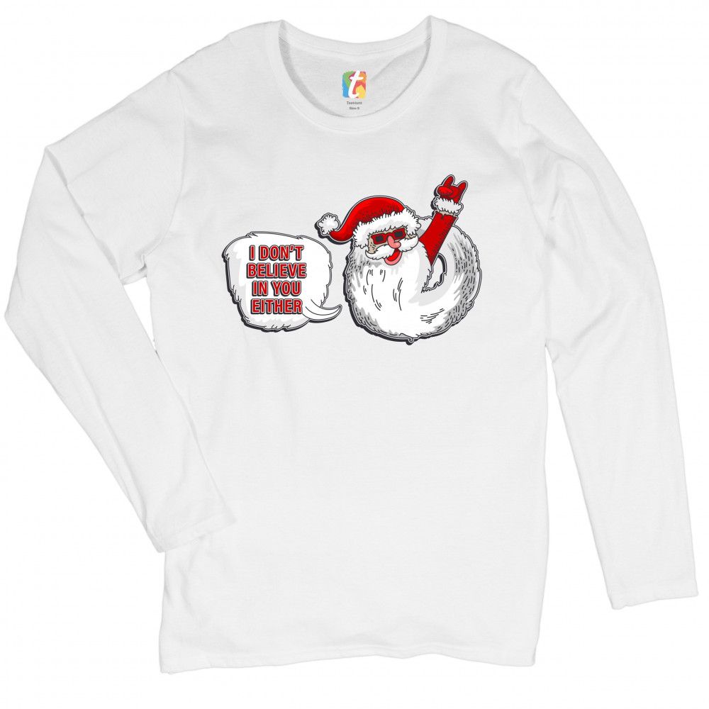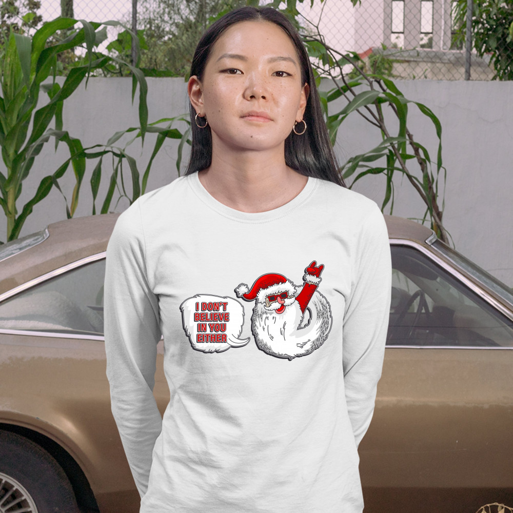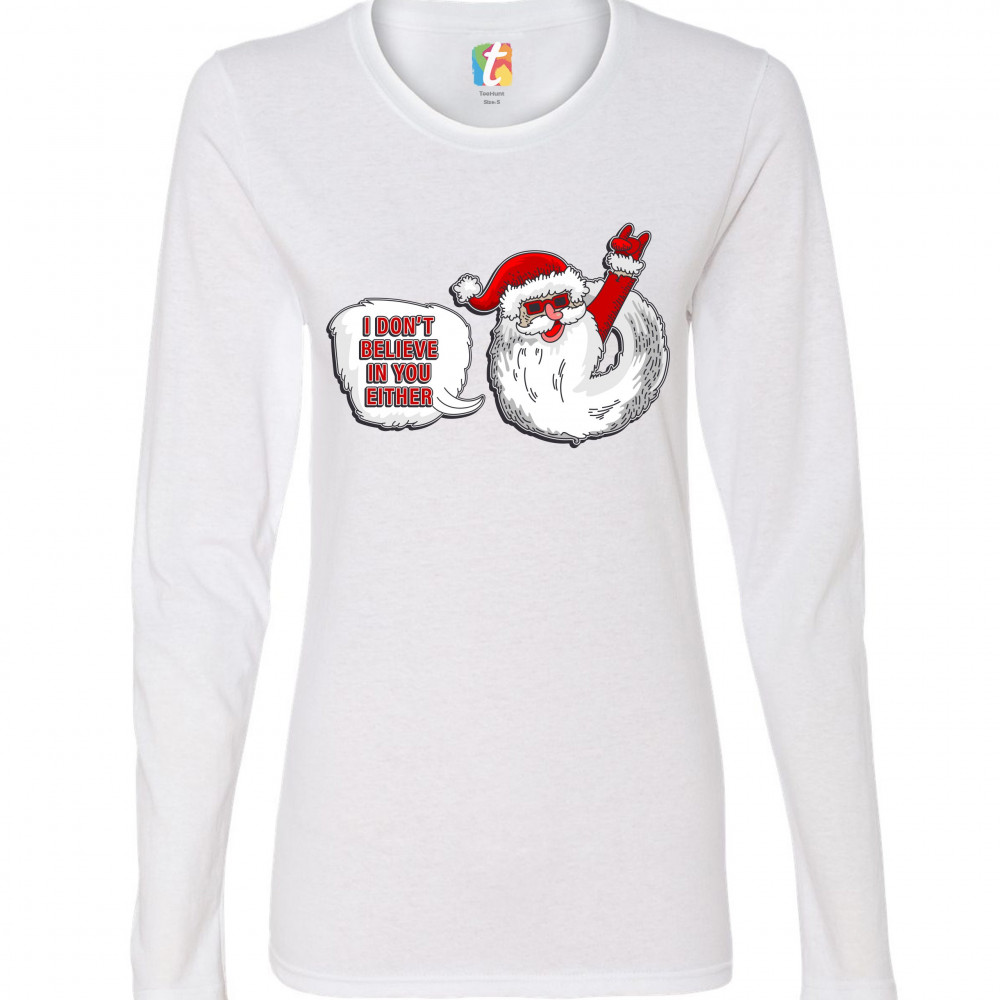 I DON'T BELIEVE IN YOU EITHER women's long sleeve t-shirt santa claus christmas white