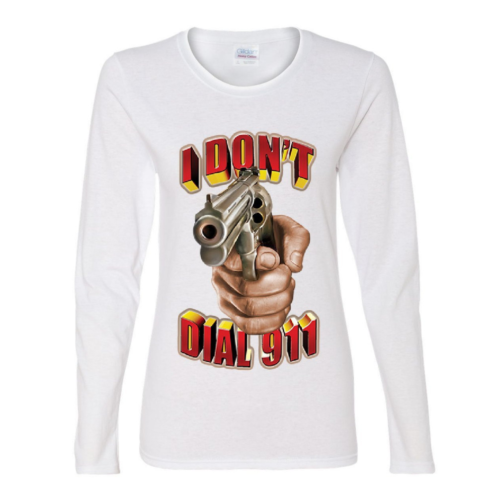 I DON'T DIAL 911 women's long sleeve tee defend 2nd amendment pro guns revolver white