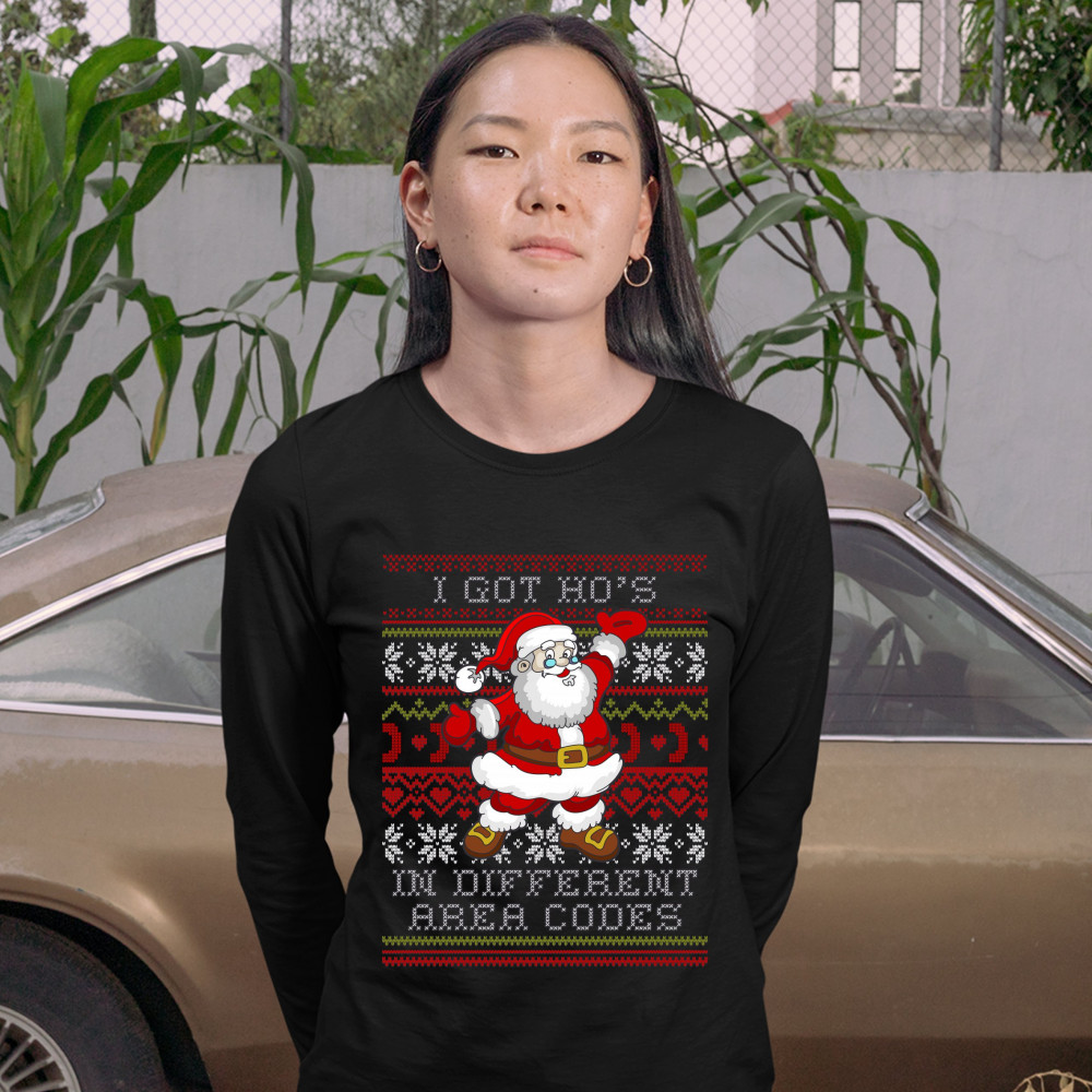 A funny print saying: "I got ho's in different area codes". It features a smiling Santa Claus and the ugly sweater pattern. Amazing choice to make people smile and spread positive vibes on Christmas Eve.