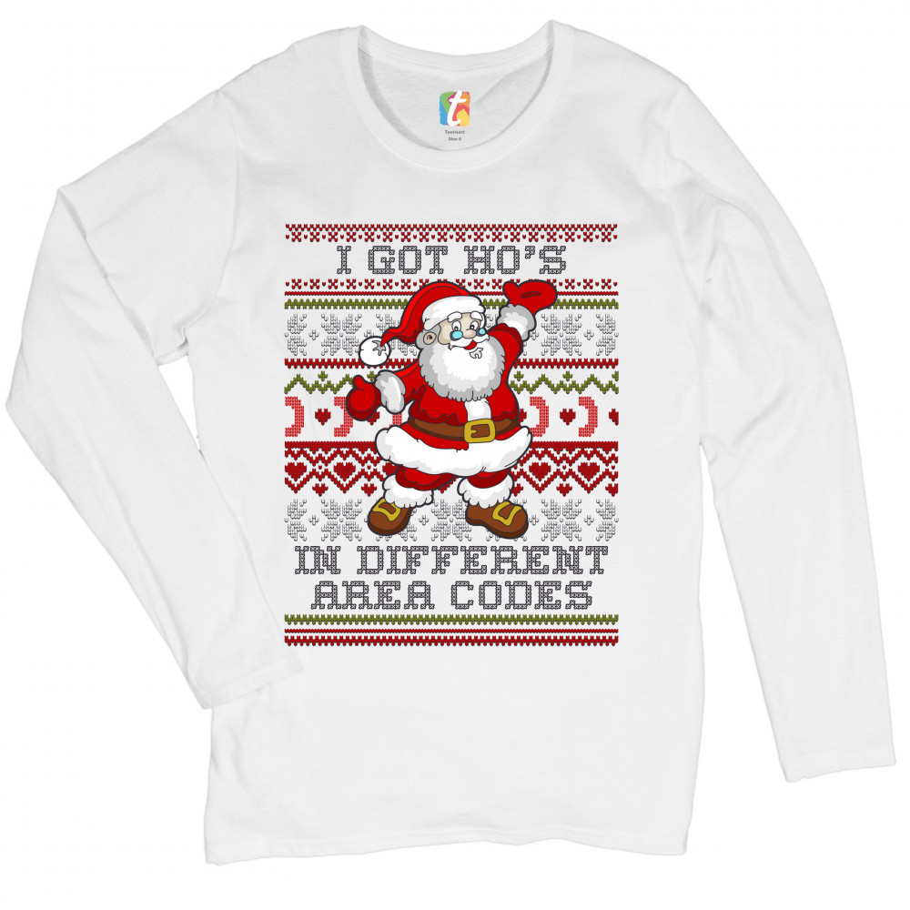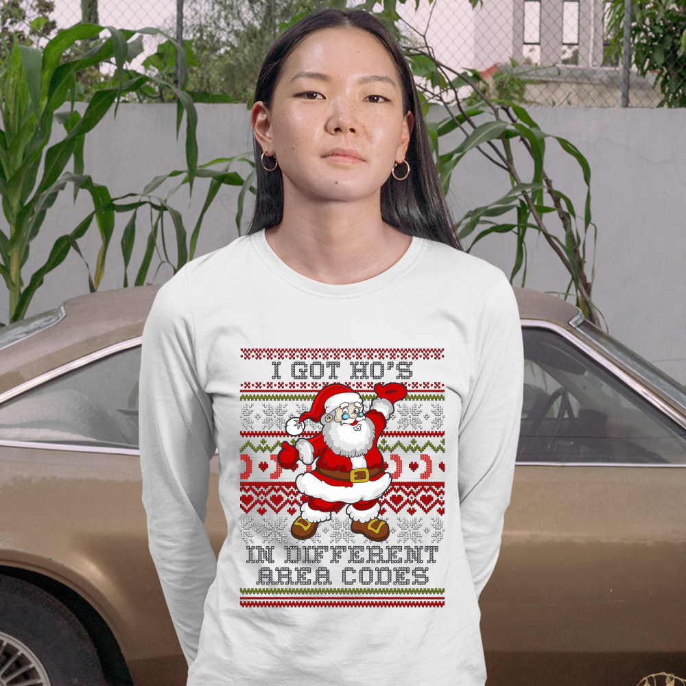 A funny print saying: "I got ho's in different area codes". It features a smiling Santa Claus and the ugly sweater pattern. Amazing choice to make people smile and spread positive vibes on Christmas Eve.
