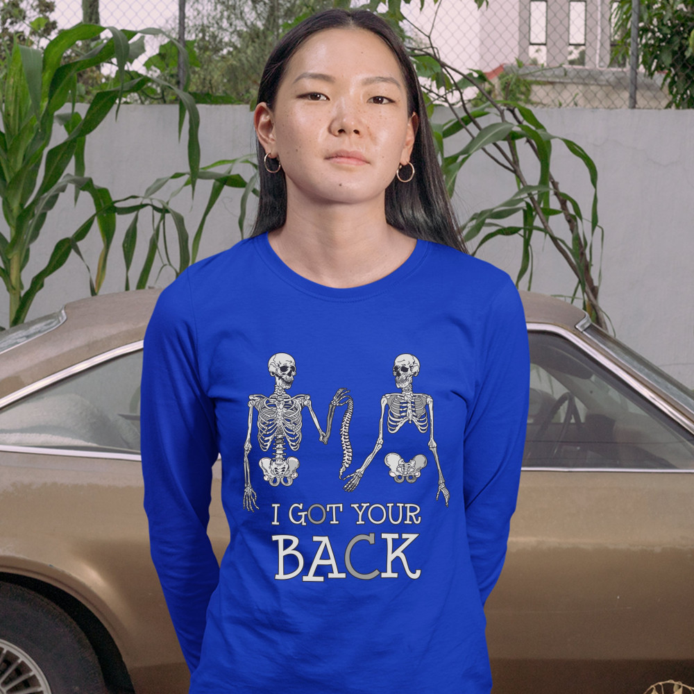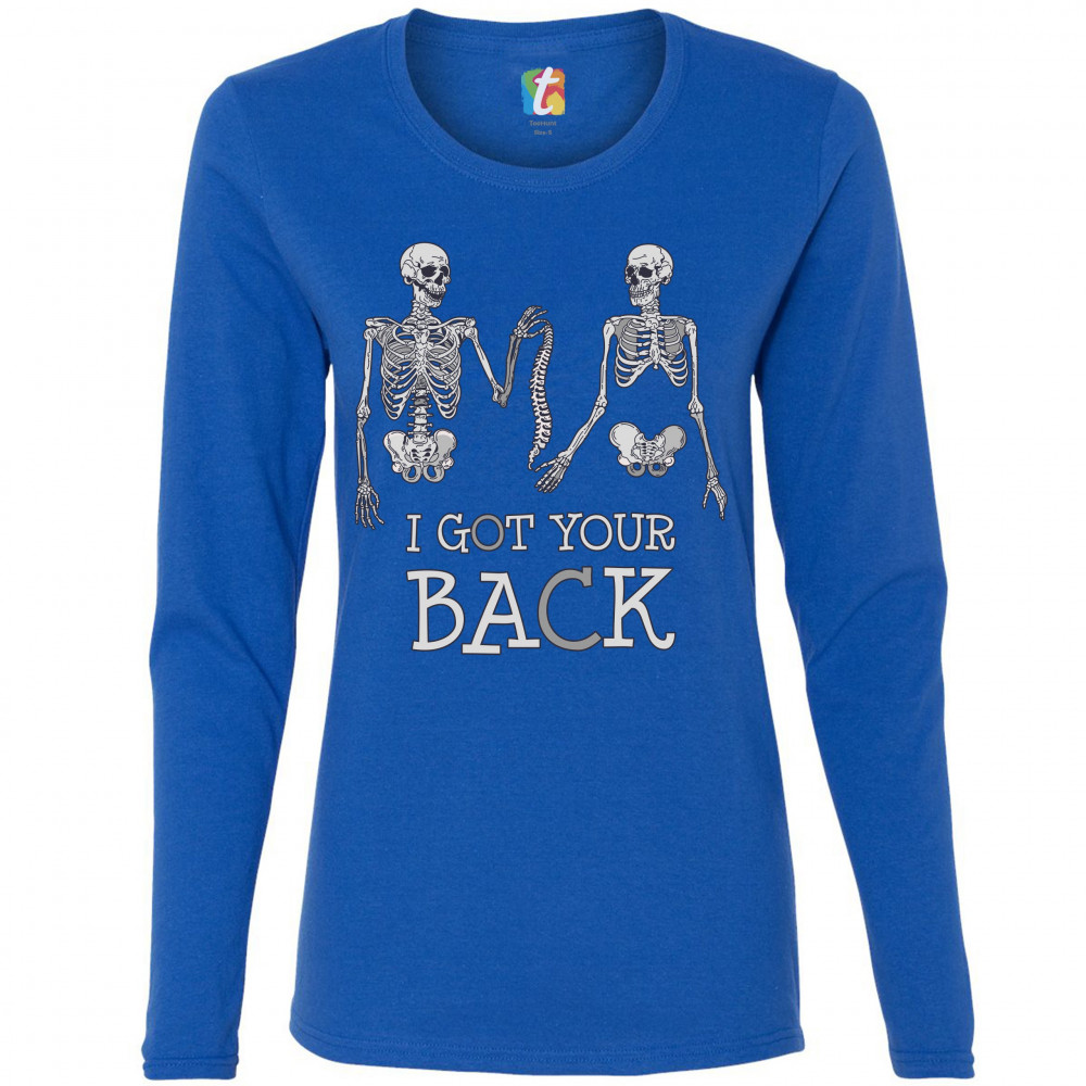 I GOT YOUR BACK women's long sleeve t-shirt happy halloween spooky skeletons royal blue
