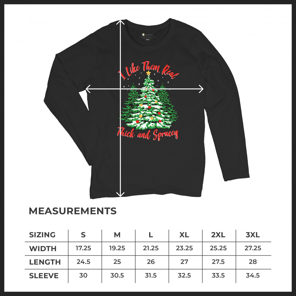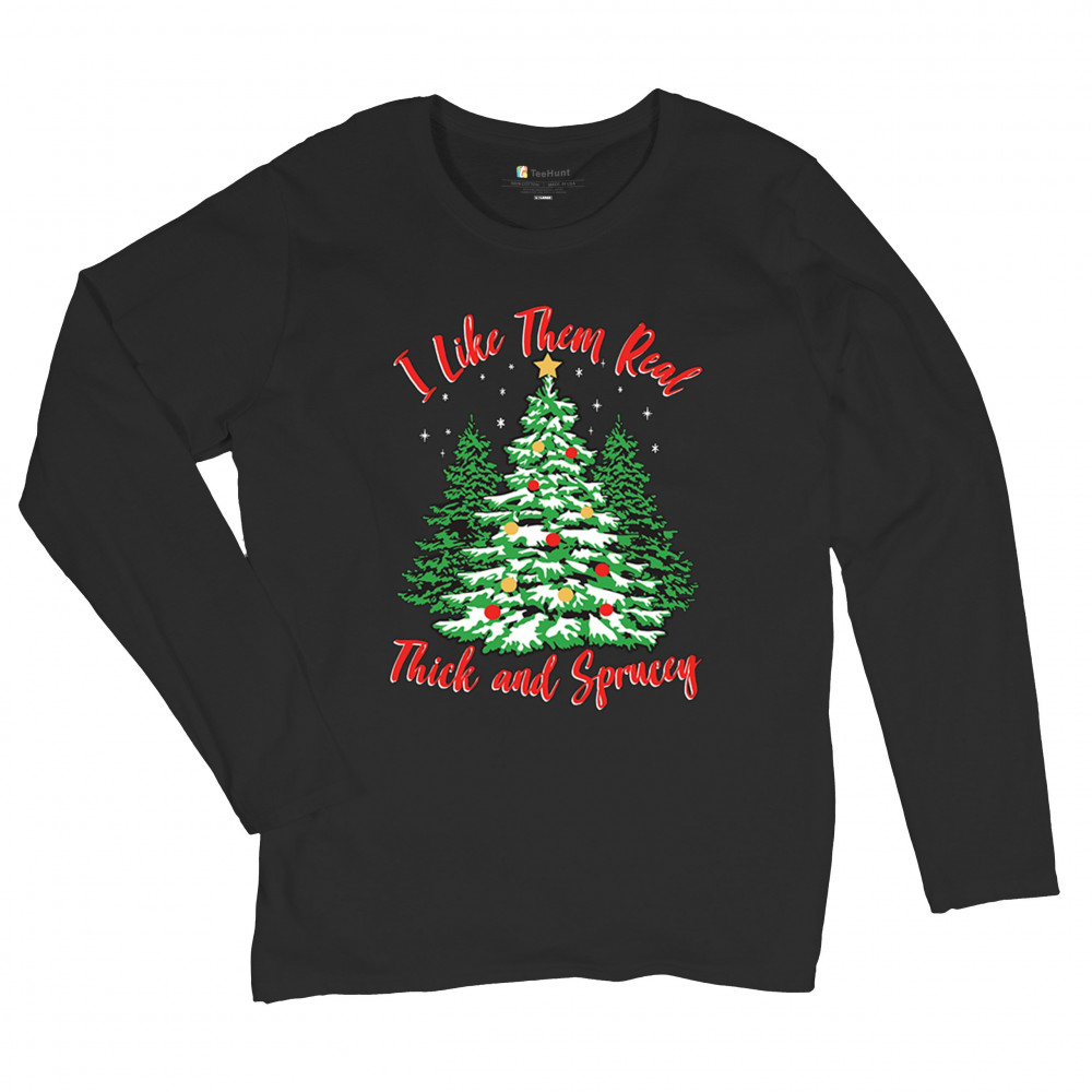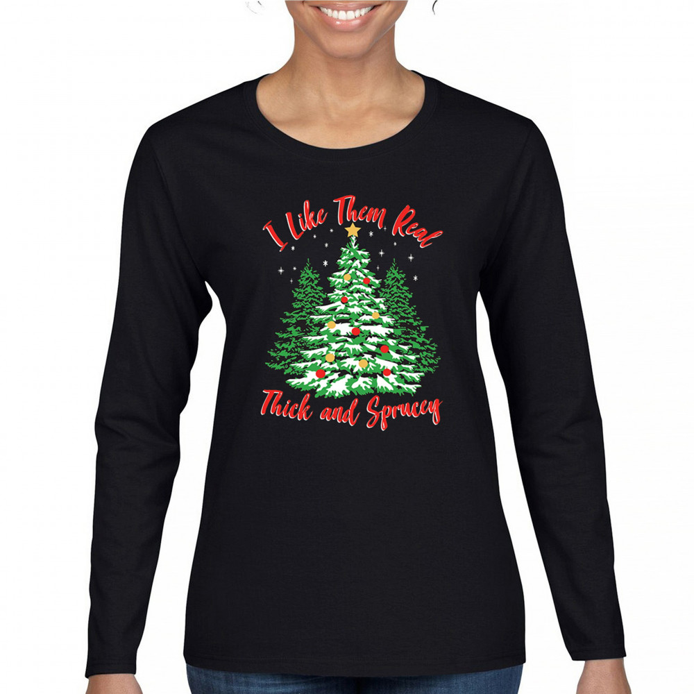 I LIKE THEM REAL THICK AND SPRUCEY women's long sleeve t-shirt christmas humor black