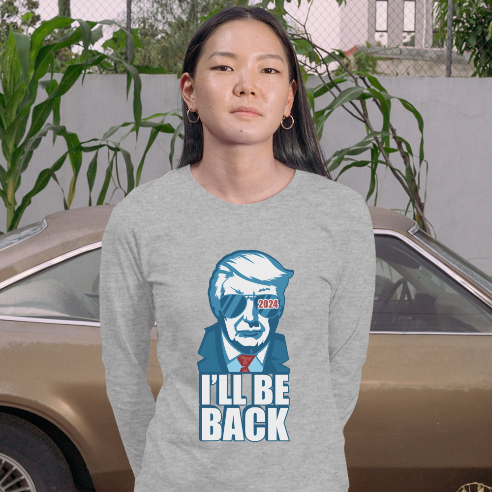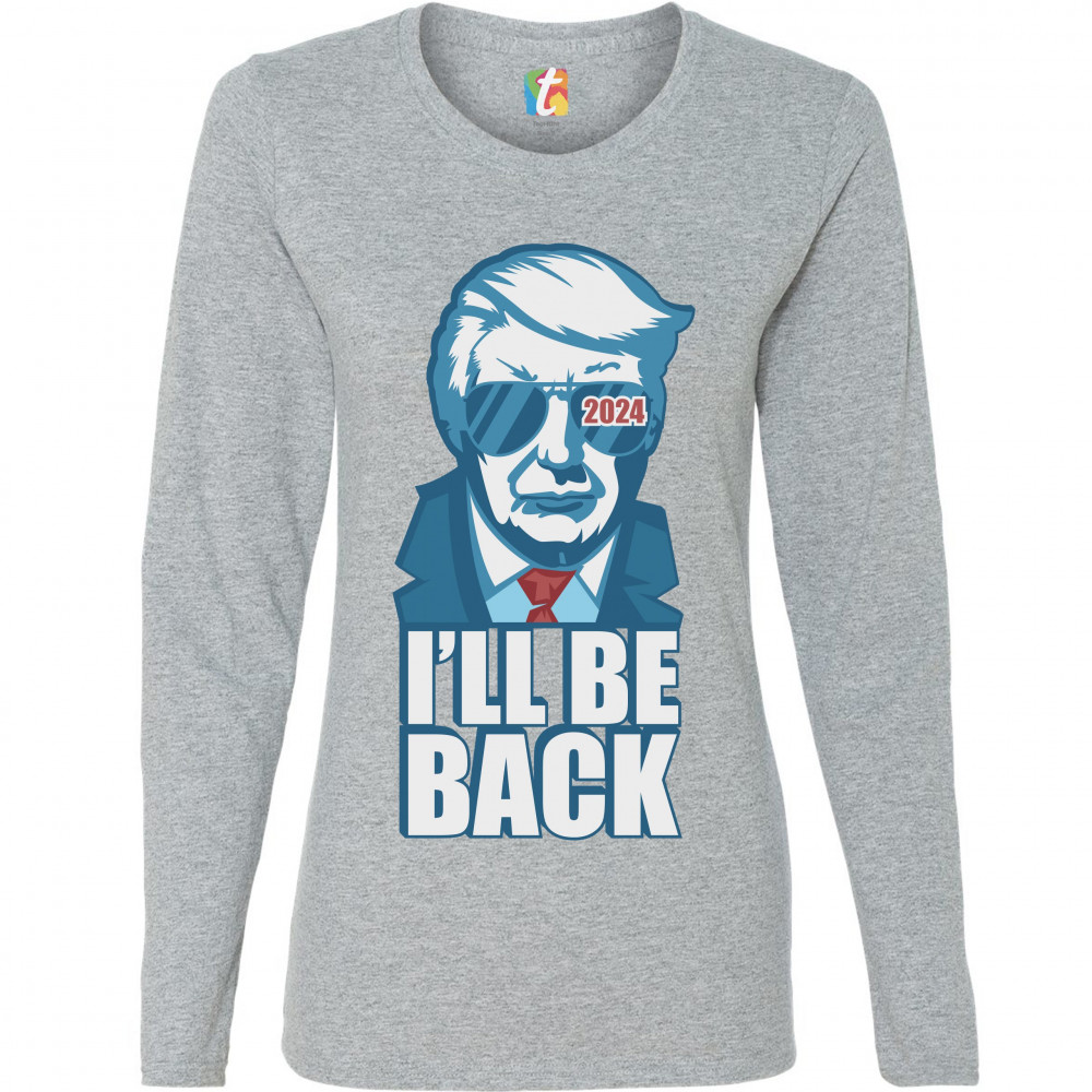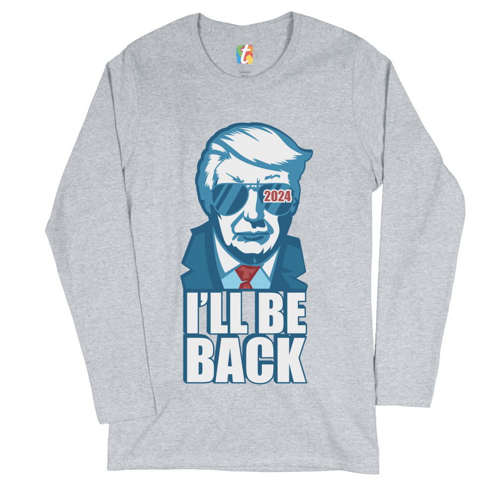 A print saying "I'll Be Back" and featuring the face of Donald Trump wearing glasses, with "2024" inside of one of the lenses. A great choice to wear to a Trump rally or give as a gift to a Donald Trump supporter before 2024 presidential elections.