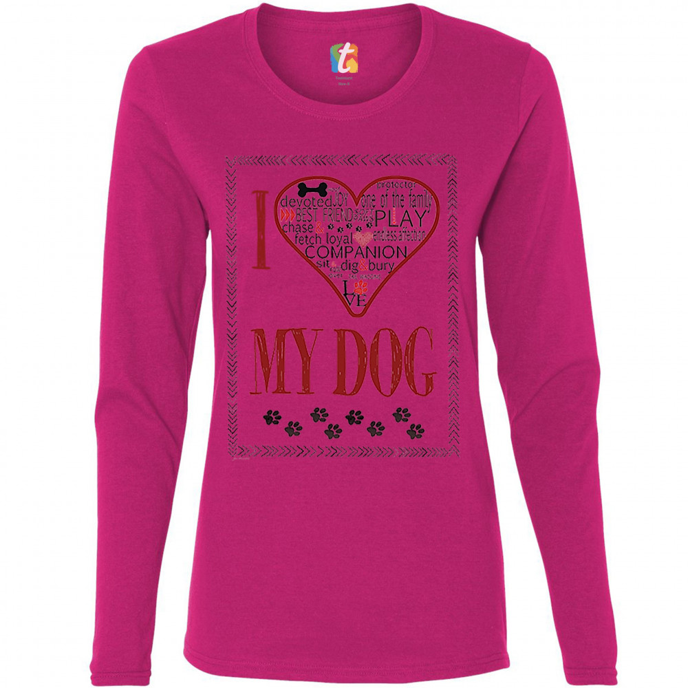 A sweet print featuring a frame inside of which, there are dog tracks and the phrase "I love my dog" in which "love" is replaced with a huge heart. The heart is filled with numerous compliments a beloved dog can be described with. A great choice for any d