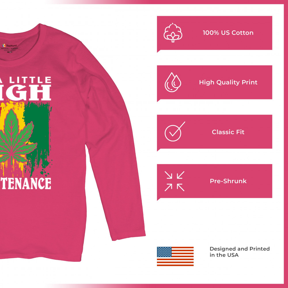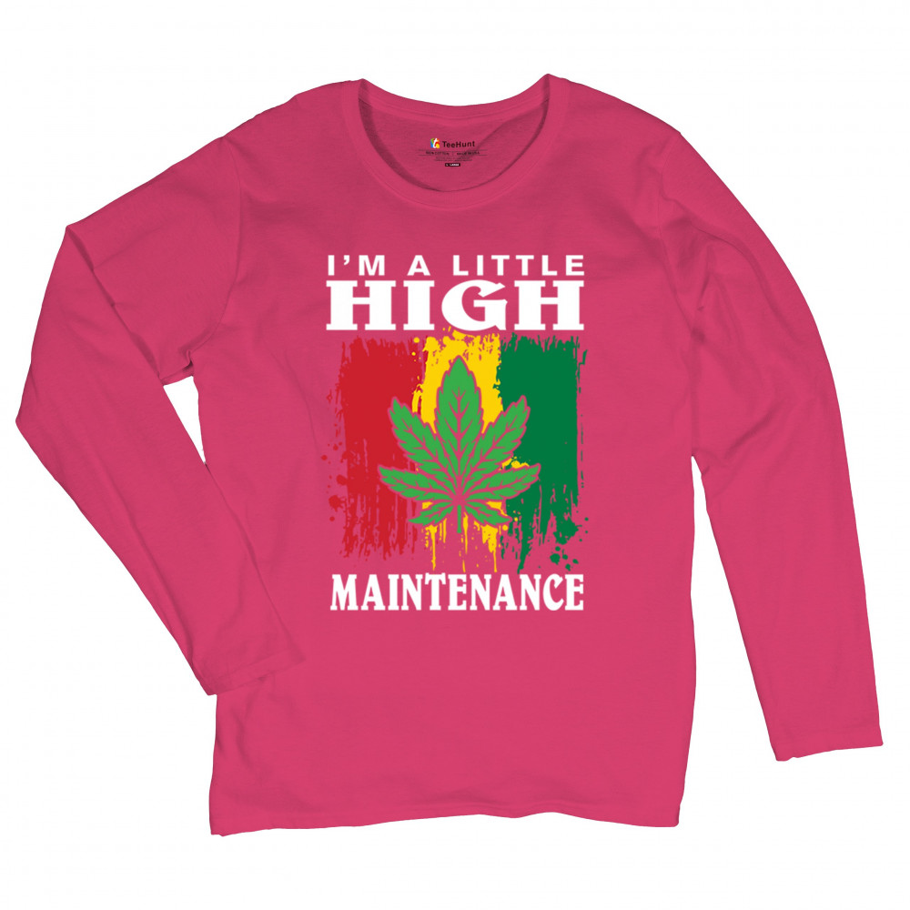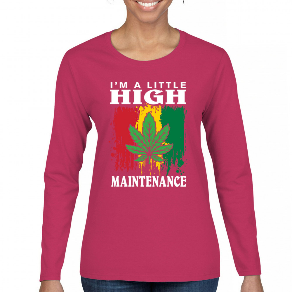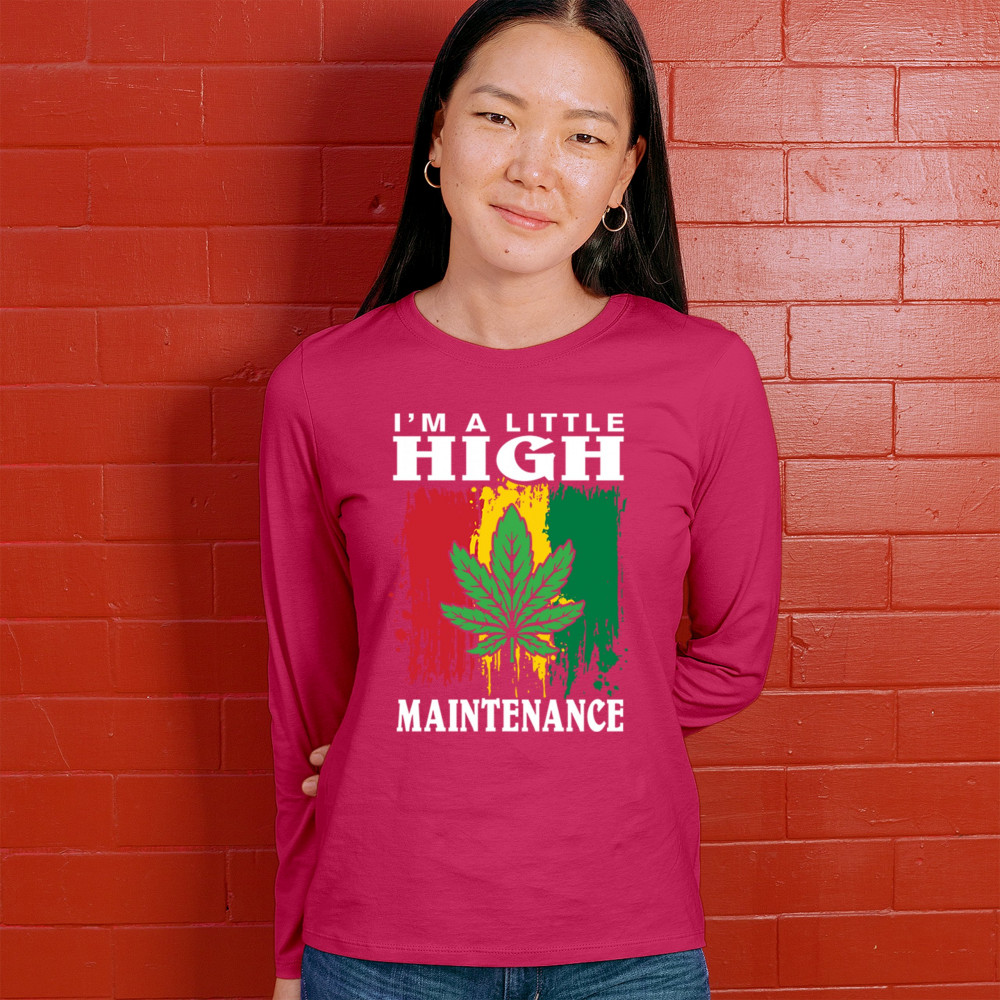 "I'm a Little High Maintenance" design with a bold cannabis leaf and vibrant background. Perfect for fans of Mary Jane, humor, and relaxed, trippy style.