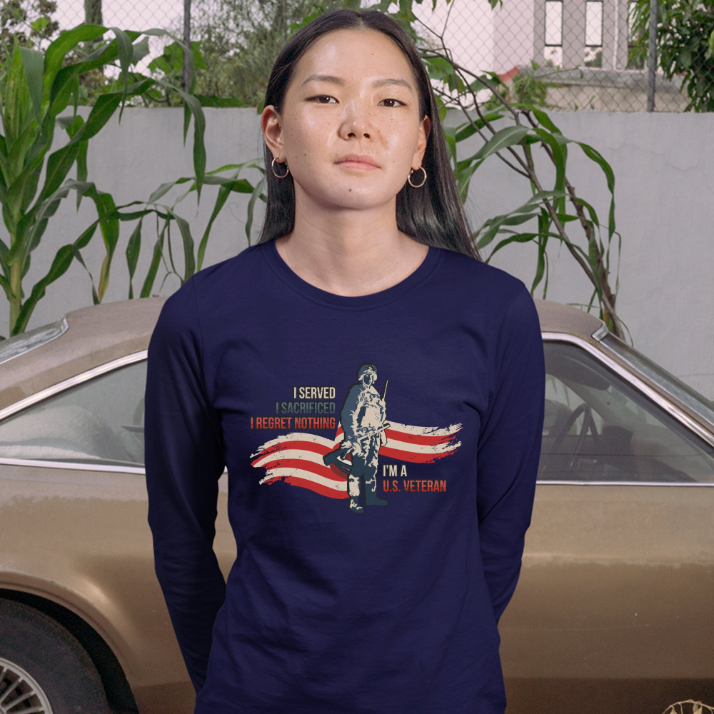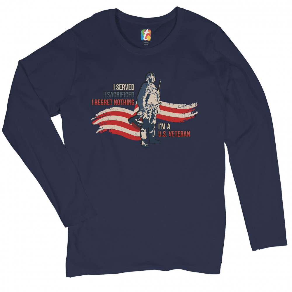 A patriotic print featuring a red-and-white stripe in the background and a soldier holding a rifle. The print says: "I Served I Sacrificed I Regreat Nothing I'm a U.S. Veteran". Great choice to wear on Independence Day or any other patriotic holiday.