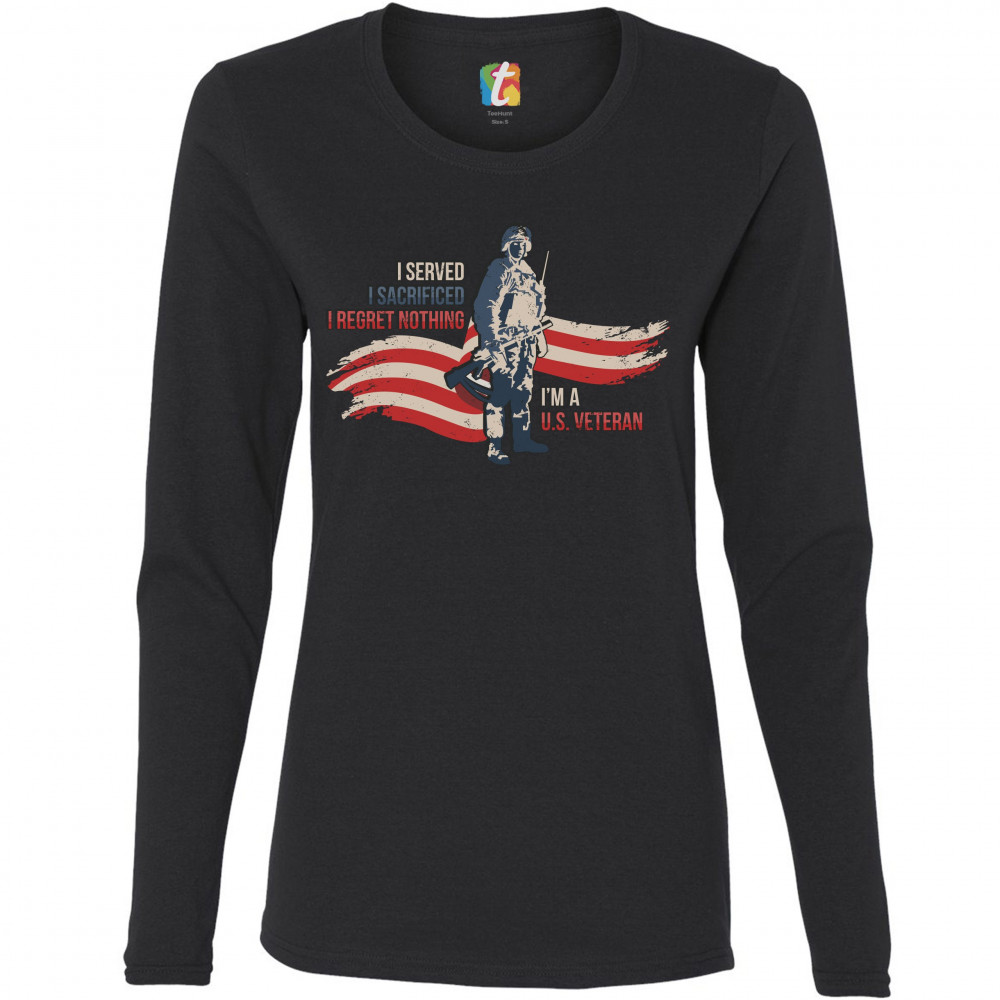 A patriotic print featuring a red-and-white stripe in the background and a soldier holding a rifle. The print says: "I Served I Sacrificed I Regreat Nothing I'm a U.S. Veteran". Great choice to wear on Independence Day or any other patriotic holiday.