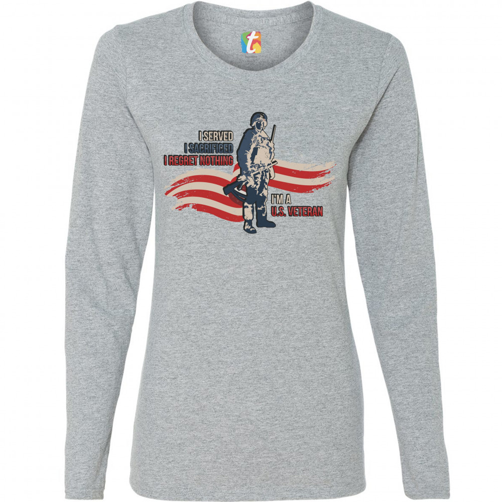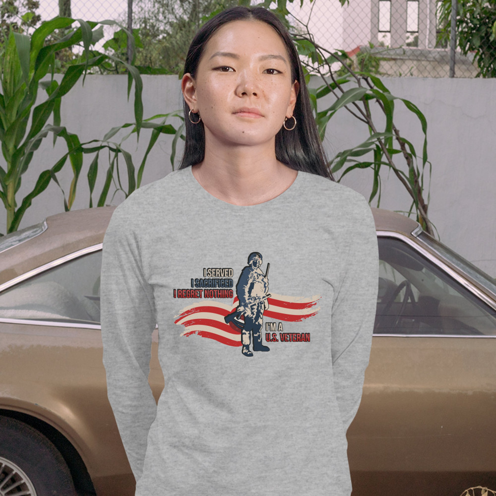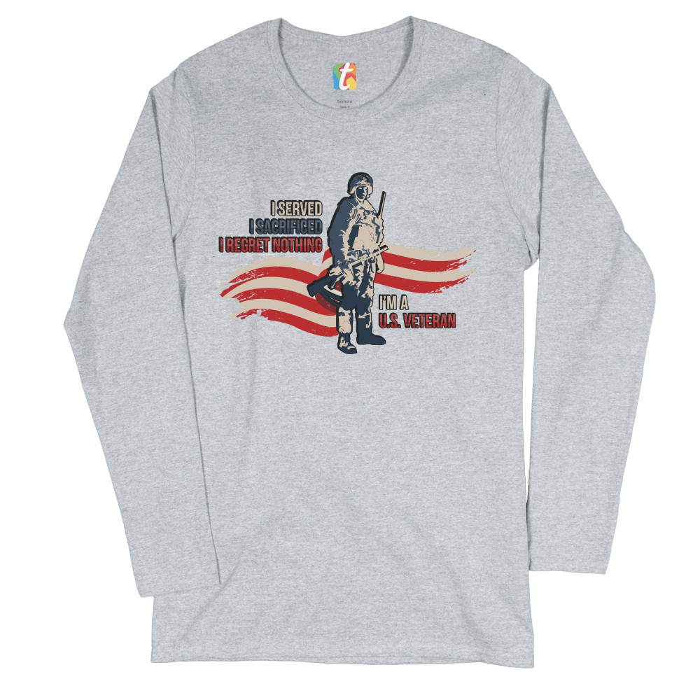 A patriotic print featuring a red-and-white stripe in the background and a soldier holding a rifle. The print says: "I Served I Sacrificed I Regreat Nothing I'm a U.S. Veteran". Great choice to wear on Independence Day or any other patriotic holiday.