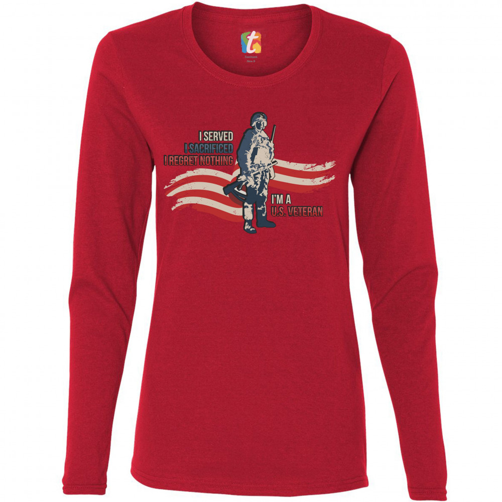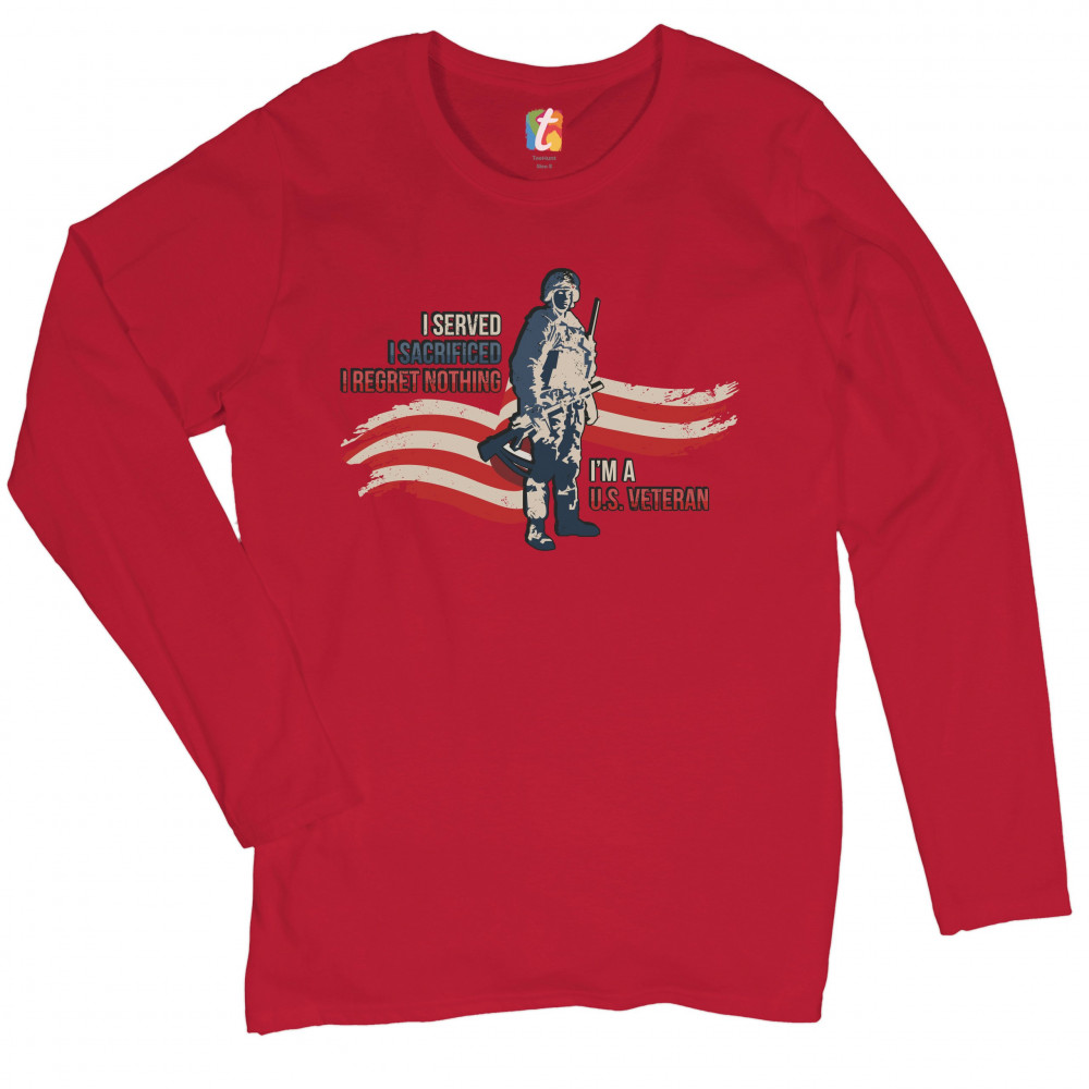 A patriotic print featuring a red-and-white stripe in the background and a soldier holding a rifle. The print says: "I Served I Sacrificed I Regreat Nothing I'm a U.S. Veteran". Great choice to wear on Independence Day or any other patriotic holiday.