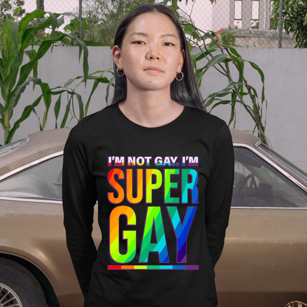 A print saying: "I'm not Gay. I'm Super Gay". The words are colored in the rainbow colors. Great choice to wear as a proud queer person.