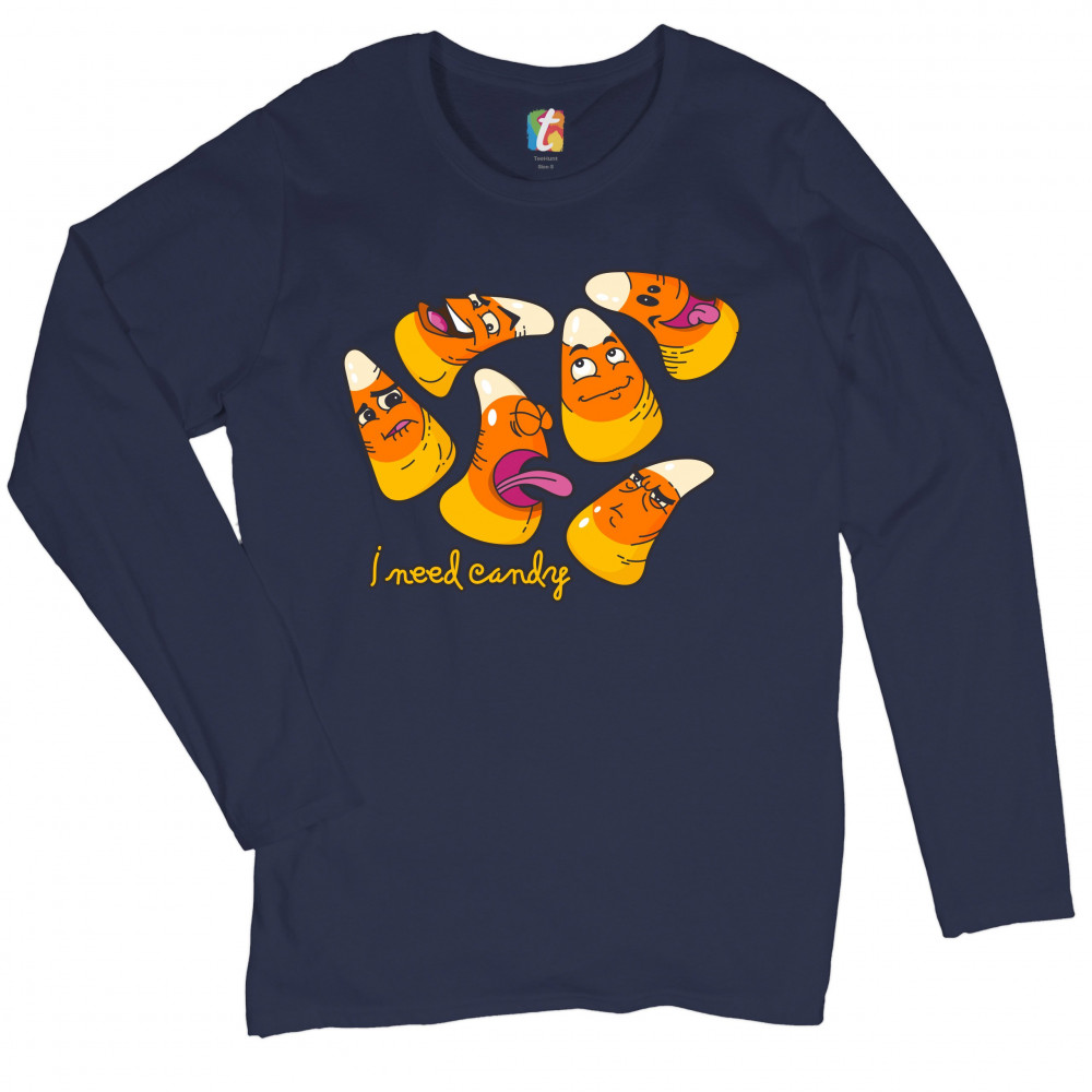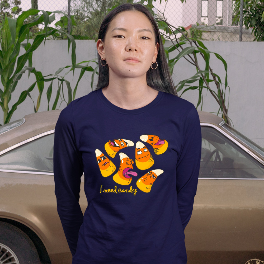 I NEED CANDY women's long sleeve t-shirt happy halloween trick-or-treating navy blue