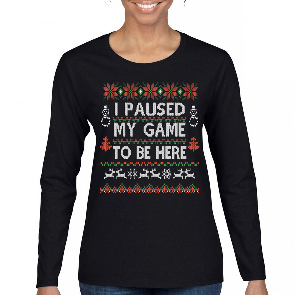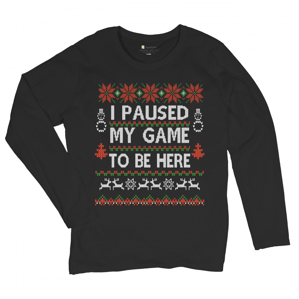 I PAUSED MY GAME TO BE HERE UGLY SWEATER THEME i paused my game to be here ugly sweater women's long sleeve t-shirt christmas black
