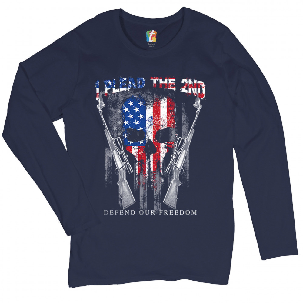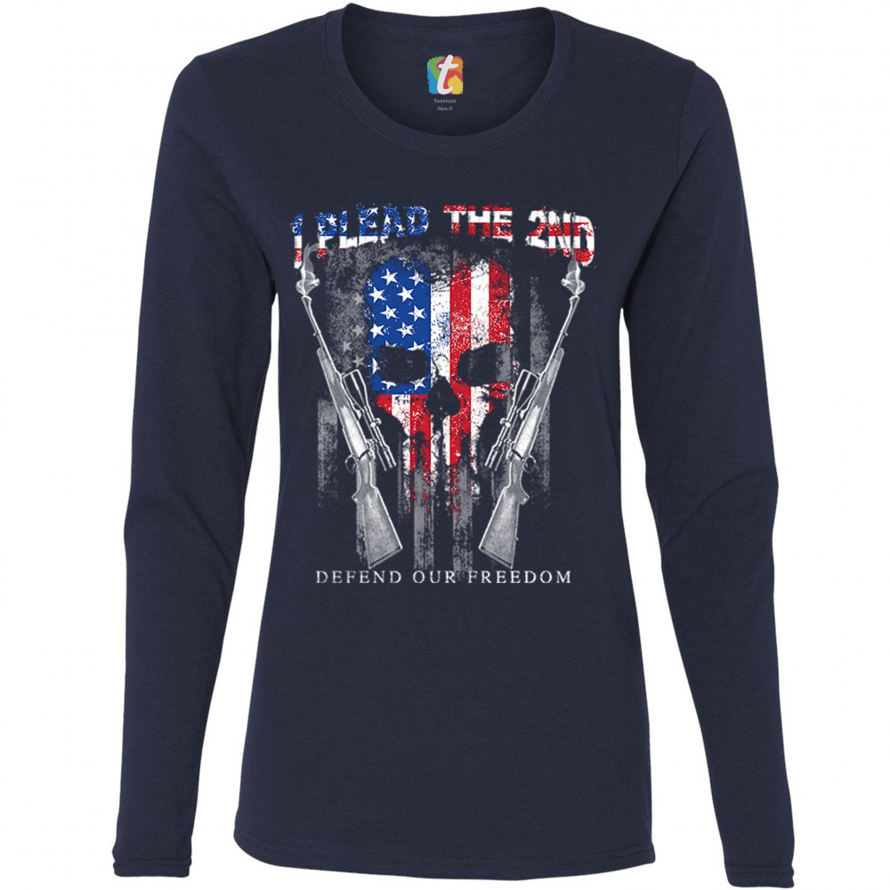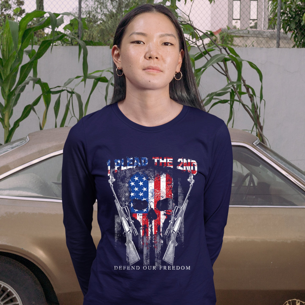 I PLEAD THE 2ND DEFEND OUR FREEDOM women's long sleeve t-shirt american flag navy blue