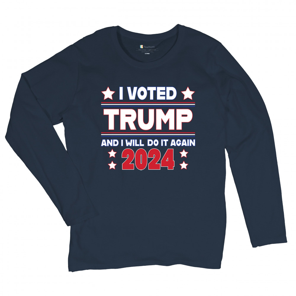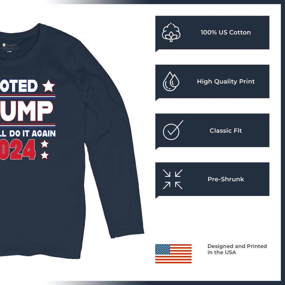 Stand tall as a dedicated Trump supporter with our "I Voted Trump and Will Do It Again 2024" design, showcasing your unwavering commitment to the America First agenda. Let the world know that you stand ready to cast your vote for President Trump once more