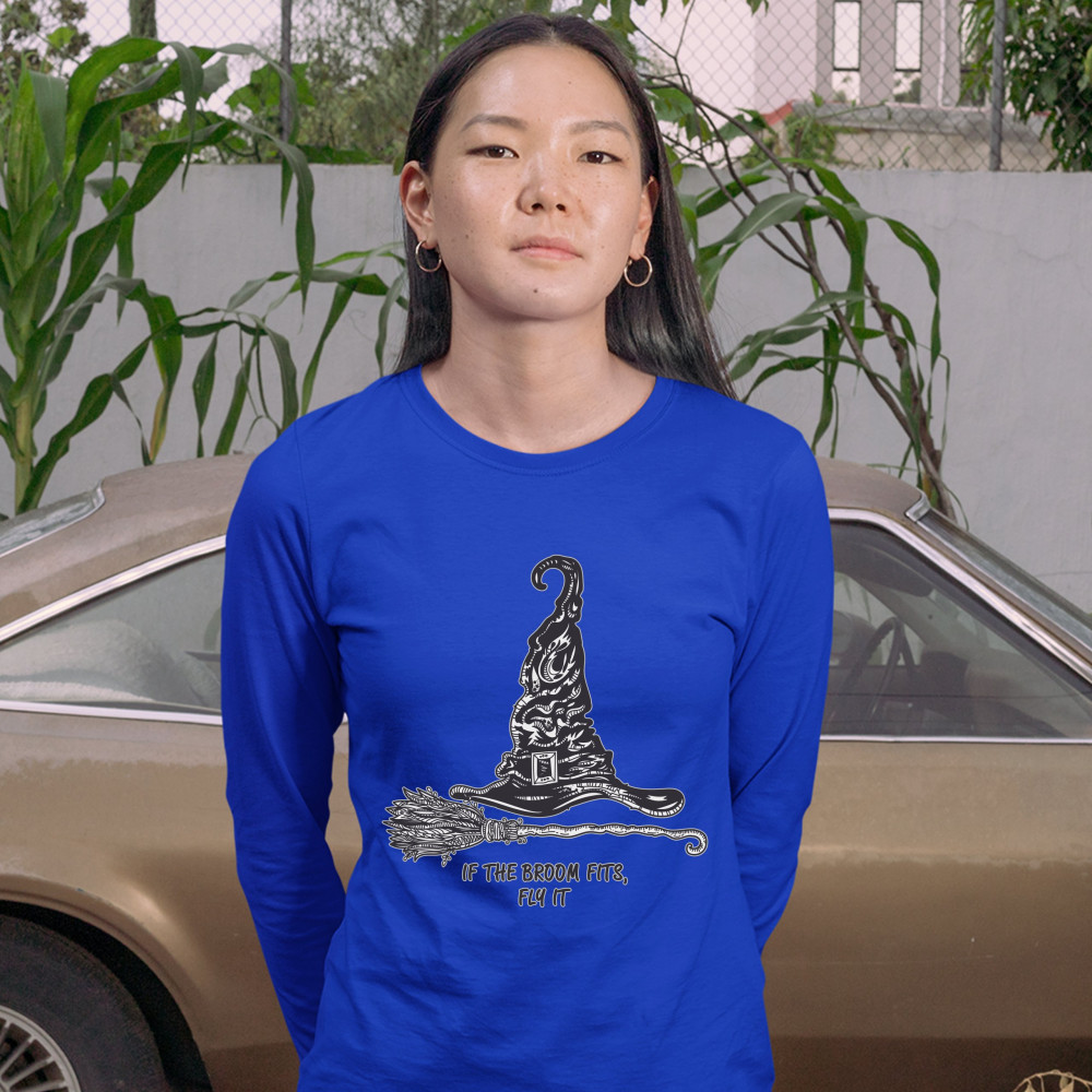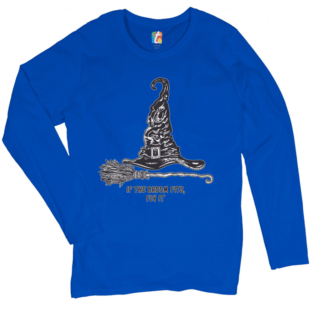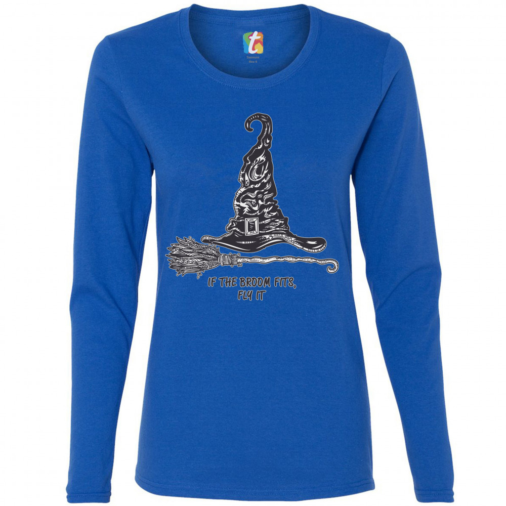 IF THE BROOM FITS, FLY IT women's long sleeve t-shirt funny witch hat halloween royal blue
