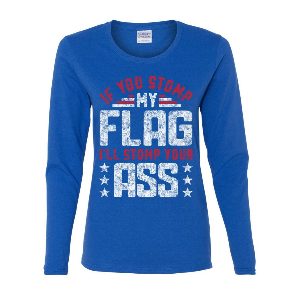 IF YOU STOMP MY FLAG women's long sleeve tee defend american flag patriot usa royal blue