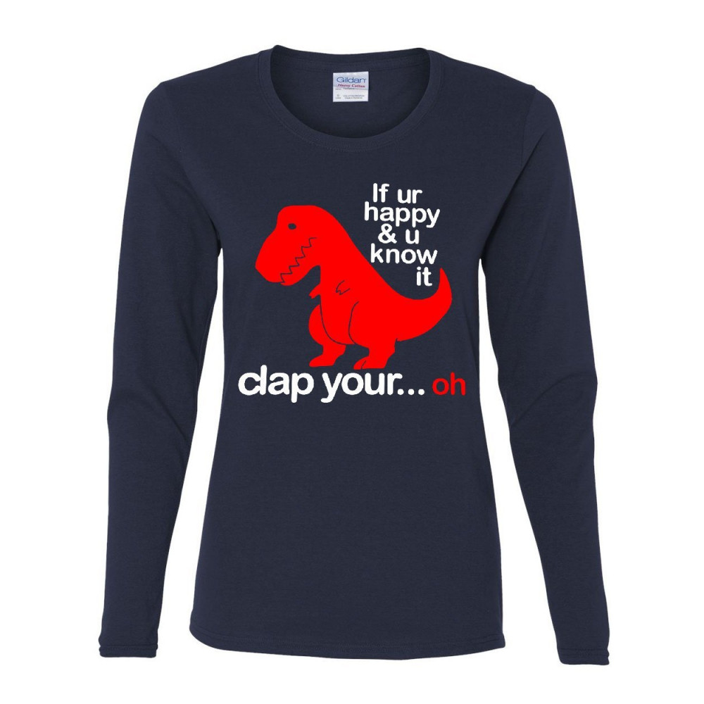 IF YOU'RE HAPPY AND YOU KNOW IT women's long sleeve tee t-rex fail funny dino navy blue