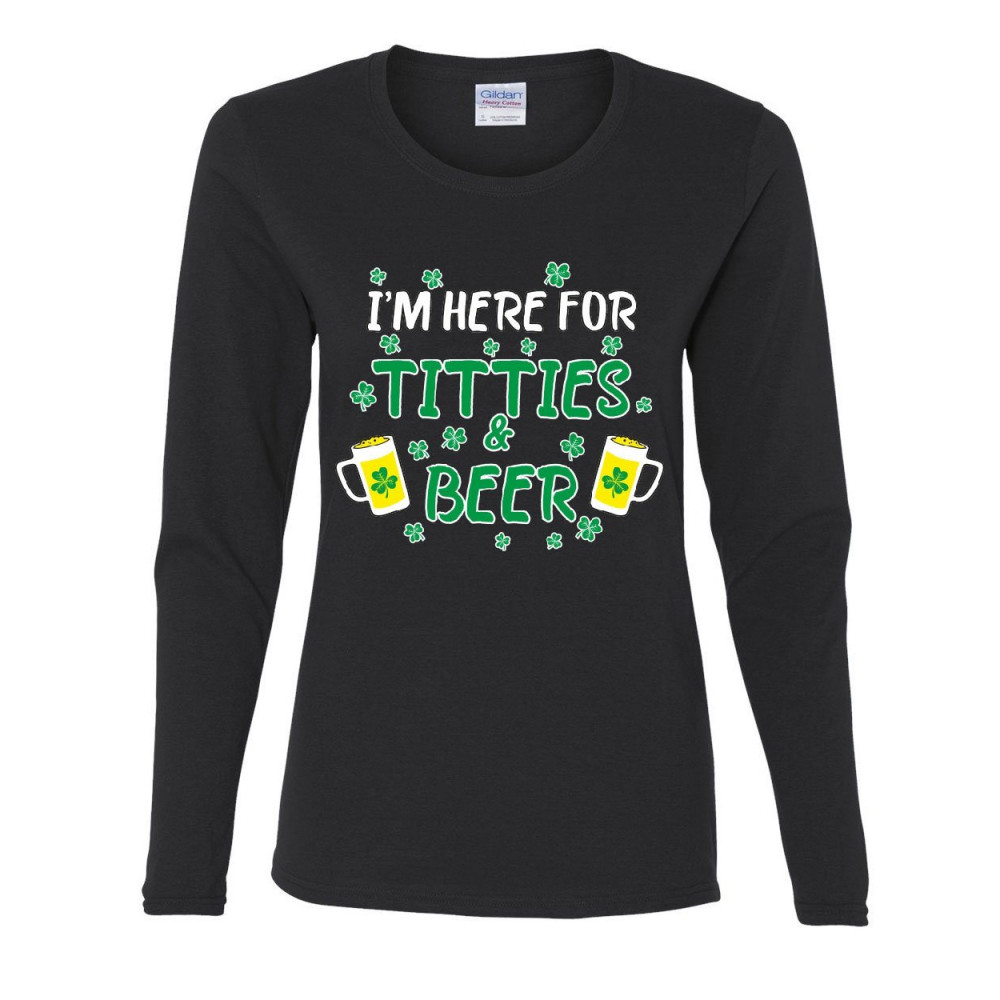 I'M HERE FOR TITTIES & BEER women's long sleeve tee st patrick's day shenanigans black