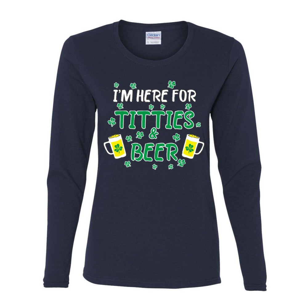 I'M HERE FOR TITTIES & BEER women's long sleeve tee st patrick's day shenanigans navy blue