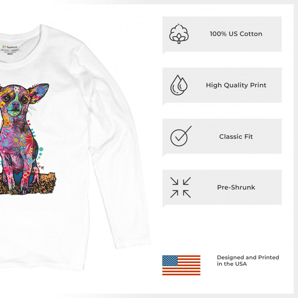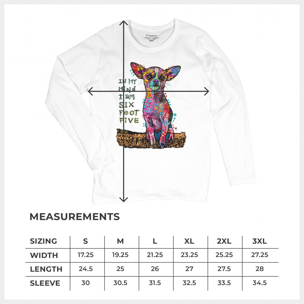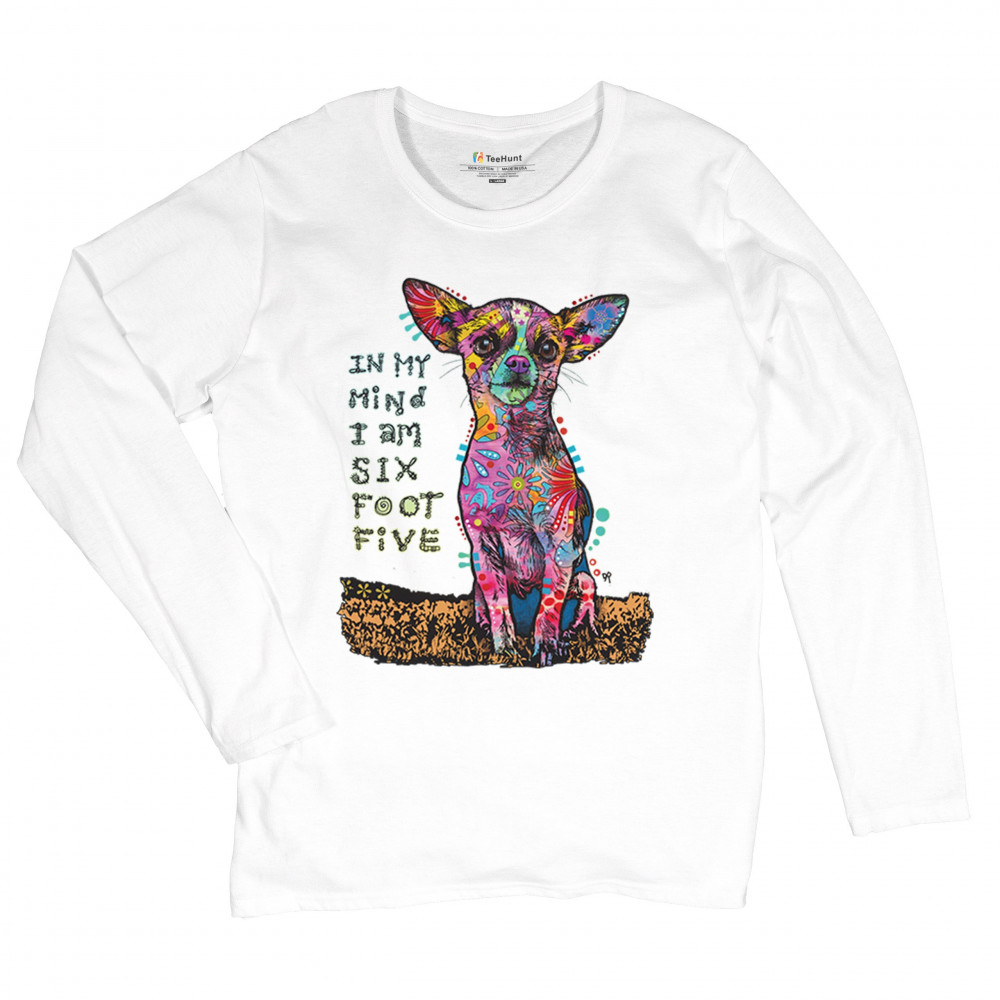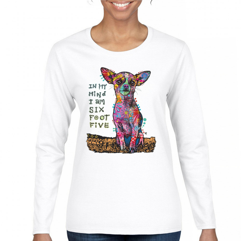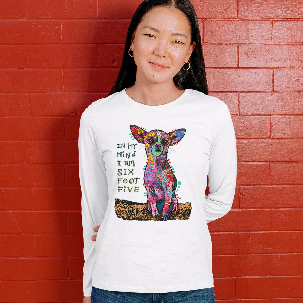 IN MY MIND I'M SIX FOOT FIVE women's long sleeve t-shirt dean russo chihuahua white