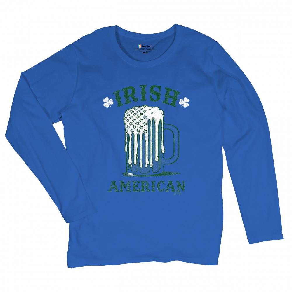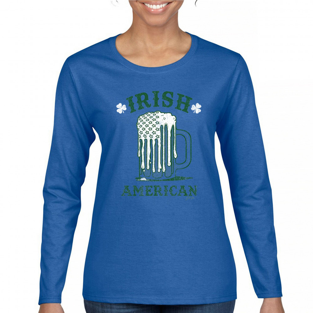 IRISH AMERICAN ST PATRICK'S DAY women's long sleeve t-shirt shamrock beer mug royal blue