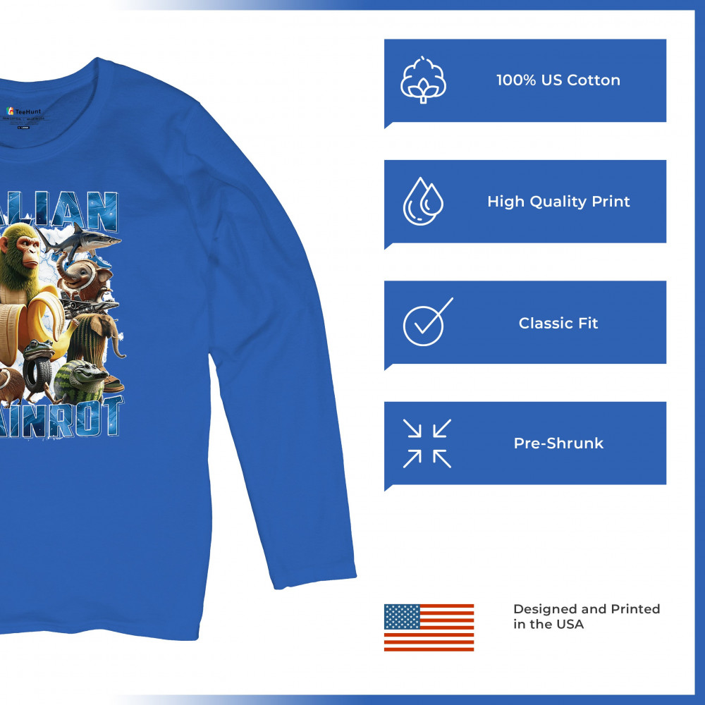 This design captures the full force of Italian brainrot—bananas, sharks, monkeys, and meme beasts collide in an unfiltered internet-core explosion. Perfect for fans of cursed humor, Gen Z trends, absurd fashion, TikTok memes, ironic style, surreal pop art, chaotic culture, digital nonsense, Gen Alpha brainrot, and hyper-online energy.