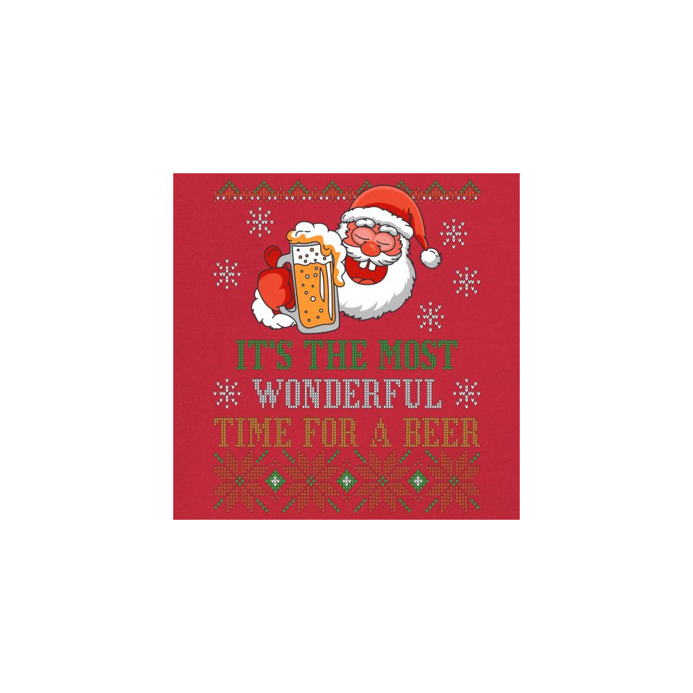 A print saying: "It's the Most Wonderful Time for a Beer" and featuring Santa Claus holding a glass of beer. The print is designed as an ugly sweater. Amazing choice for a single person who wants to make people smile and spread positive vibes on Christmas