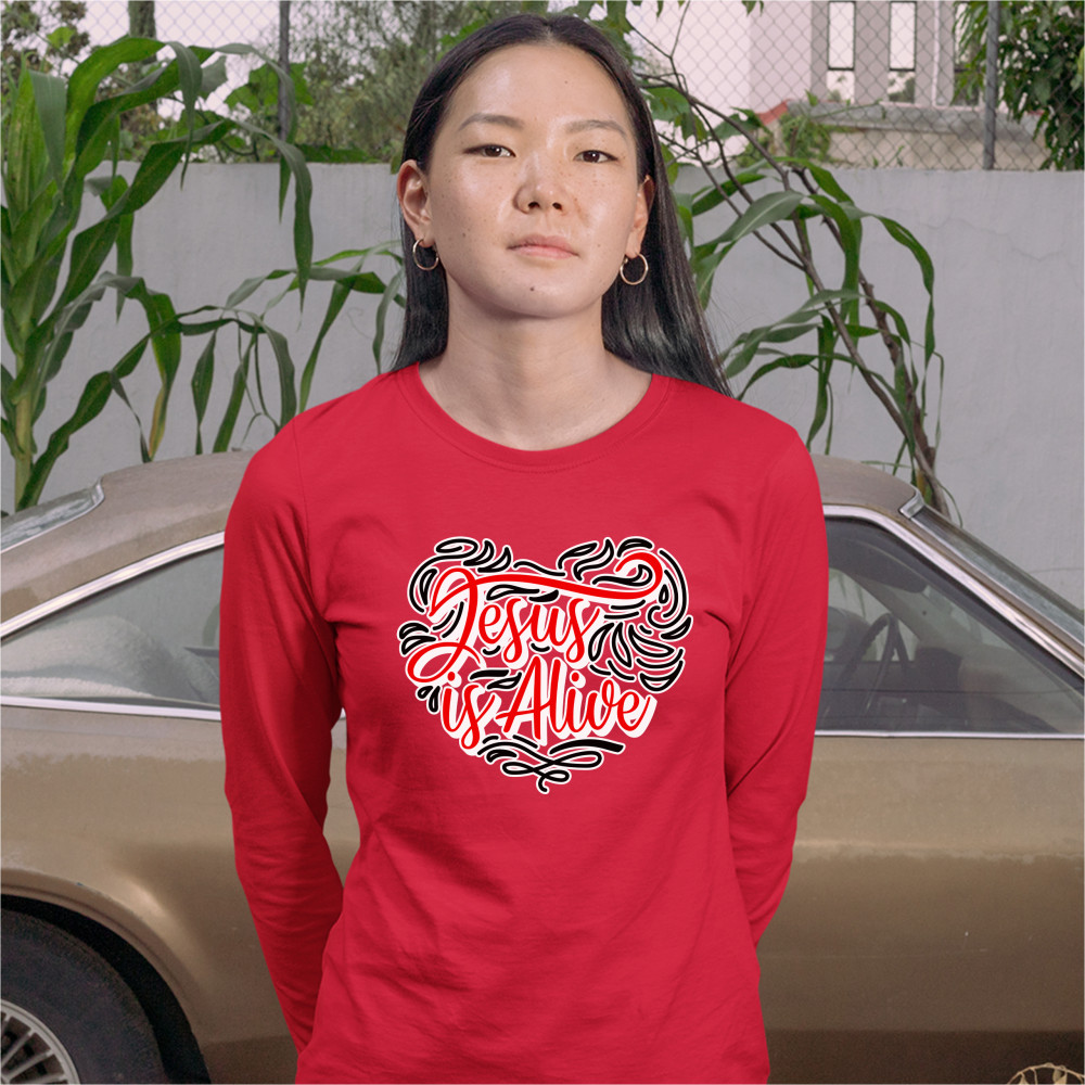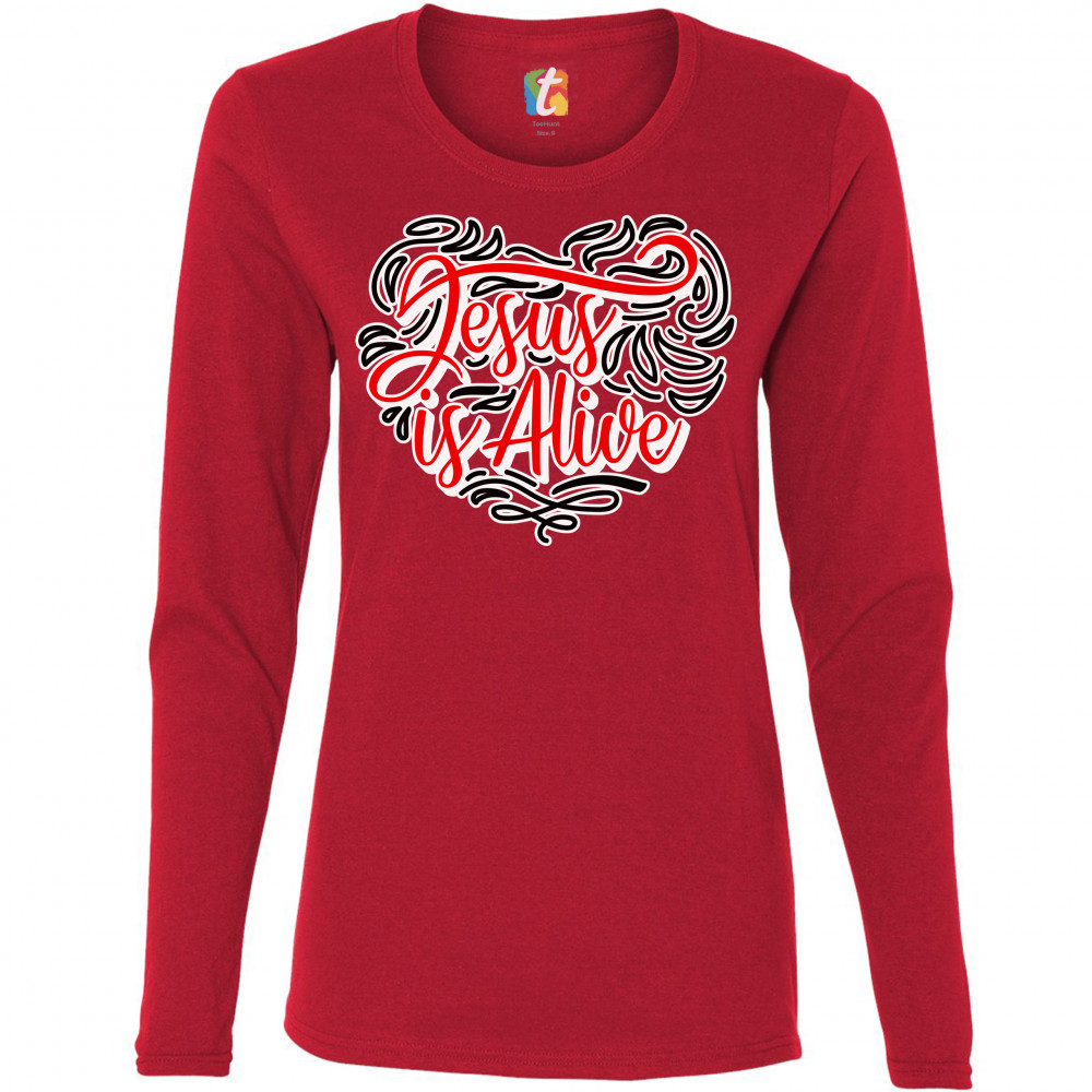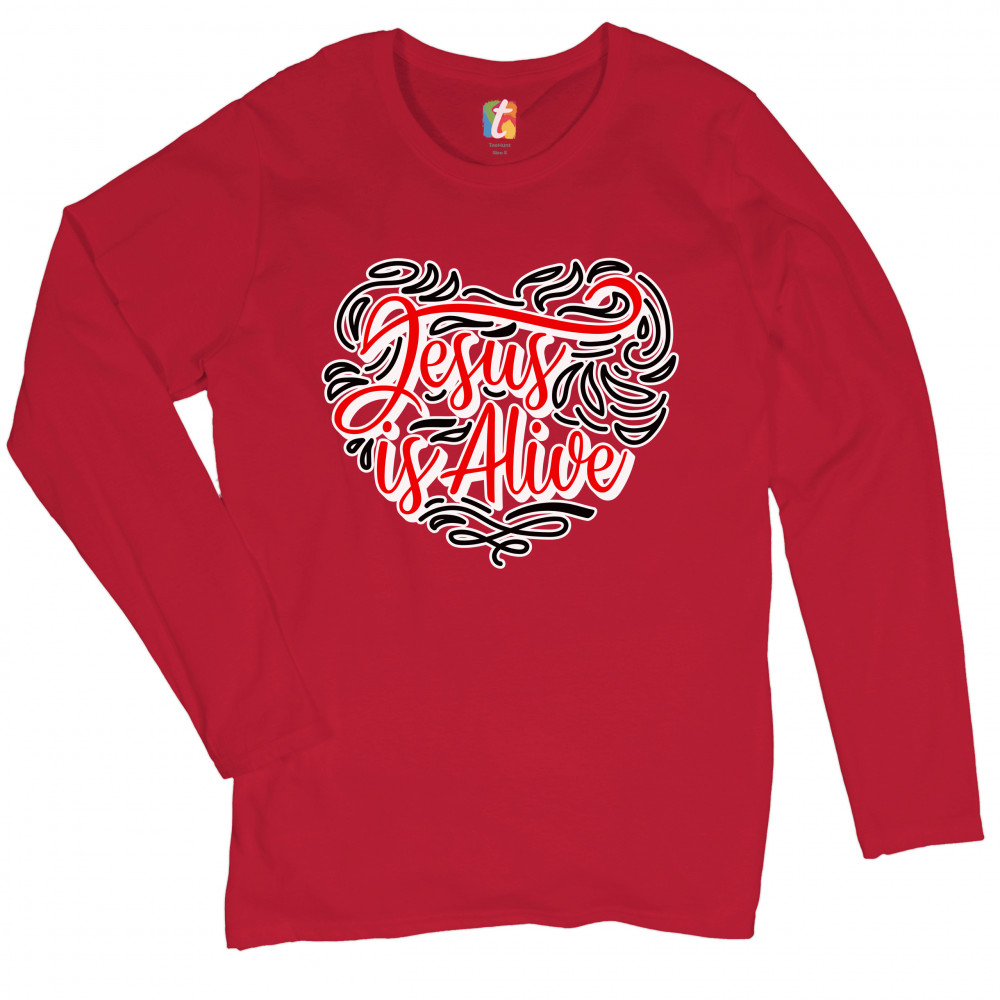 JESUS IS ALIVE women's long sleeve t-shirt happy easter bible jesus christ has risen red