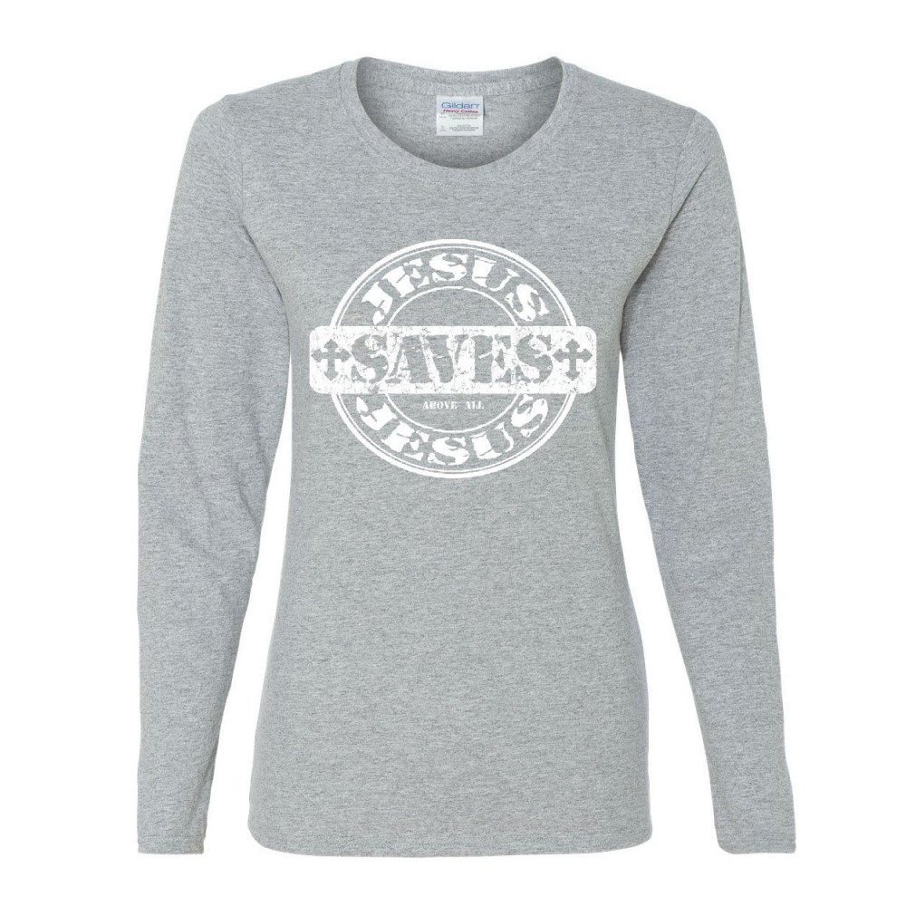 JESUS SAVES JESUS ABOVE ALL jesus saves women's long sleeve tee jesus christ above all christianity bible gray