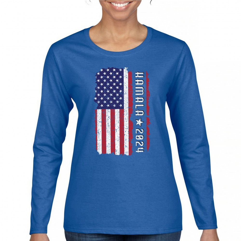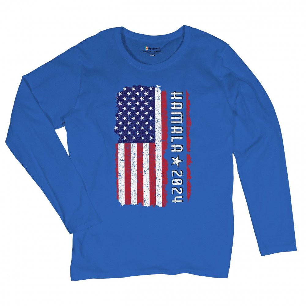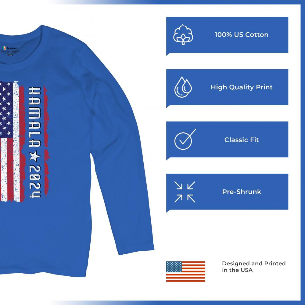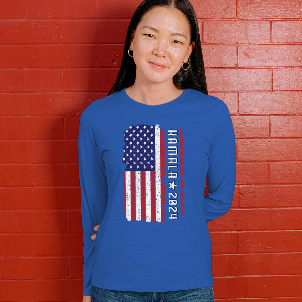 Support Kamala Harris 2024 with a bold design featuring a distressed American flag. Perfect for rallies and political events. Celebrate diversity!