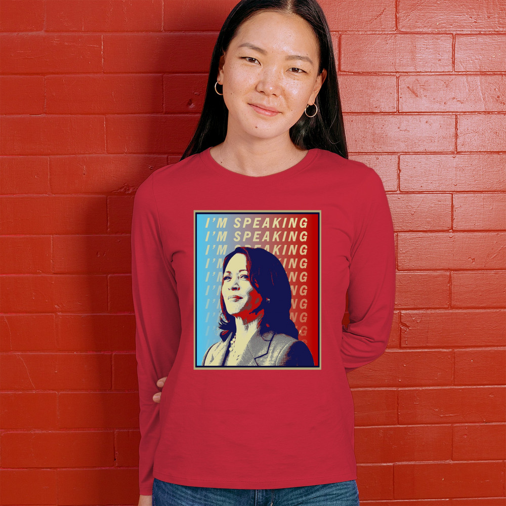 Support Kamala Harris with this bold and inspiring design. "I'M SPEAKING" echoes her powerful voice in the political arena, making it perfect for anti-Trump supporters, liberals, and Democrats. Crafted from durable materials, this design is comfortable for any event, from rallies to casual outings. Celebrate diversity and the historic candidacy of the potential first female president, resonating with black Americans, Hispanic Americans, LGBTQ supporters, and other minorities. Make a statement of hope and progress with this unique design.