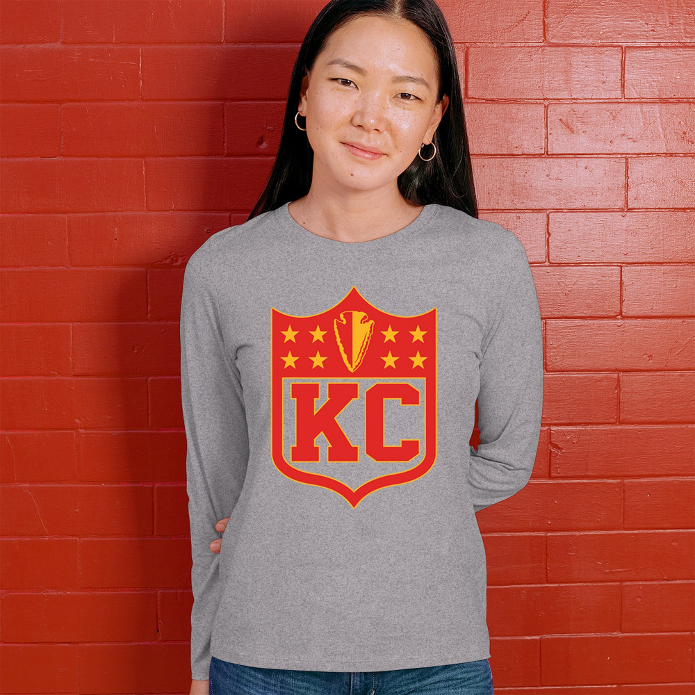 Kansas KC shield design celebrating red and gold pride, heart of America football, playoff vibes, river city culture, and big game energy.
