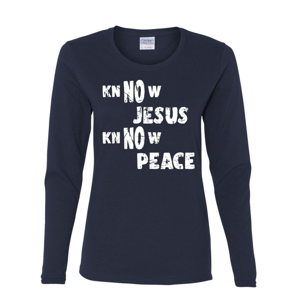KNOW JESUS KNOW PEACE women's long sleeve tee religion christian catholic faith navy blue