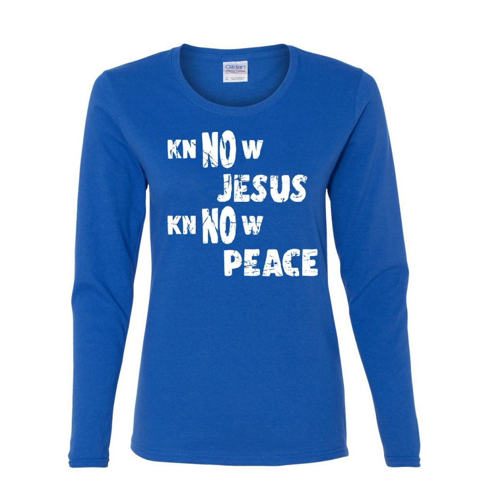 KNOW JESUS KNOW PEACE women's long sleeve tee religion christian catholic faith royal blue