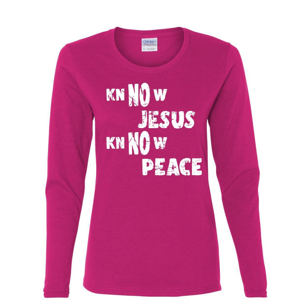 KNOW JESUS KNOW PEACE women's long sleeve tee religion christian catholic faith pink