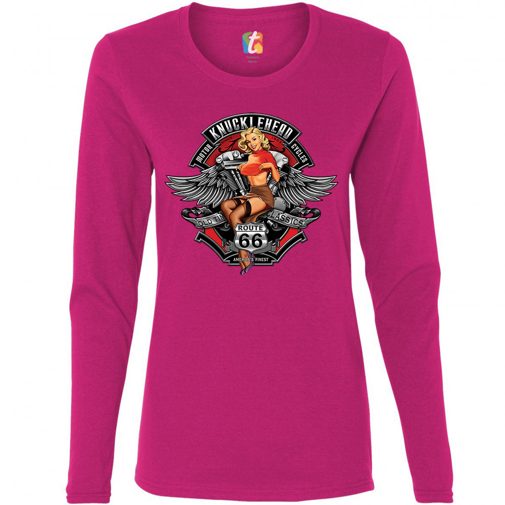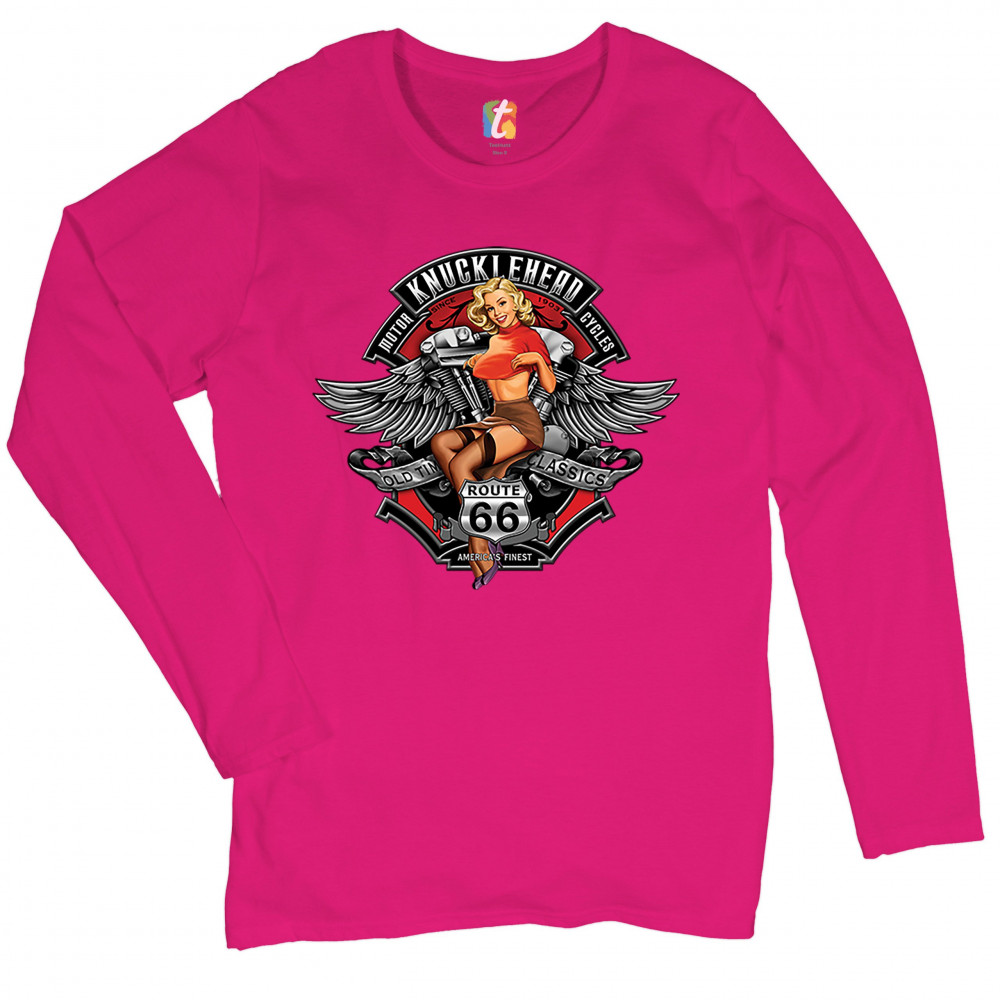 A print featuring a sexy pin-up girl. In front of her legs there is a "Route 66" sign. In the background there is a motorcycle engine and wings behind it. The print says: "Knucklehead motorcycles since 1903. Old time classics. America's finest". A great c