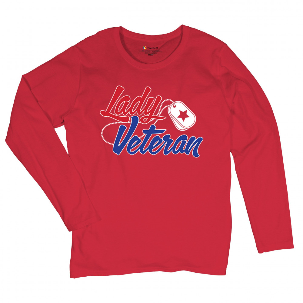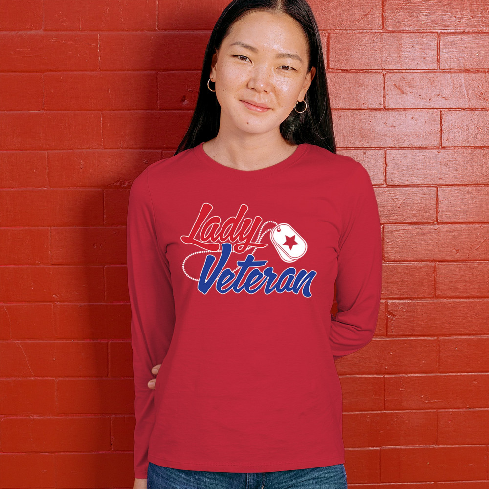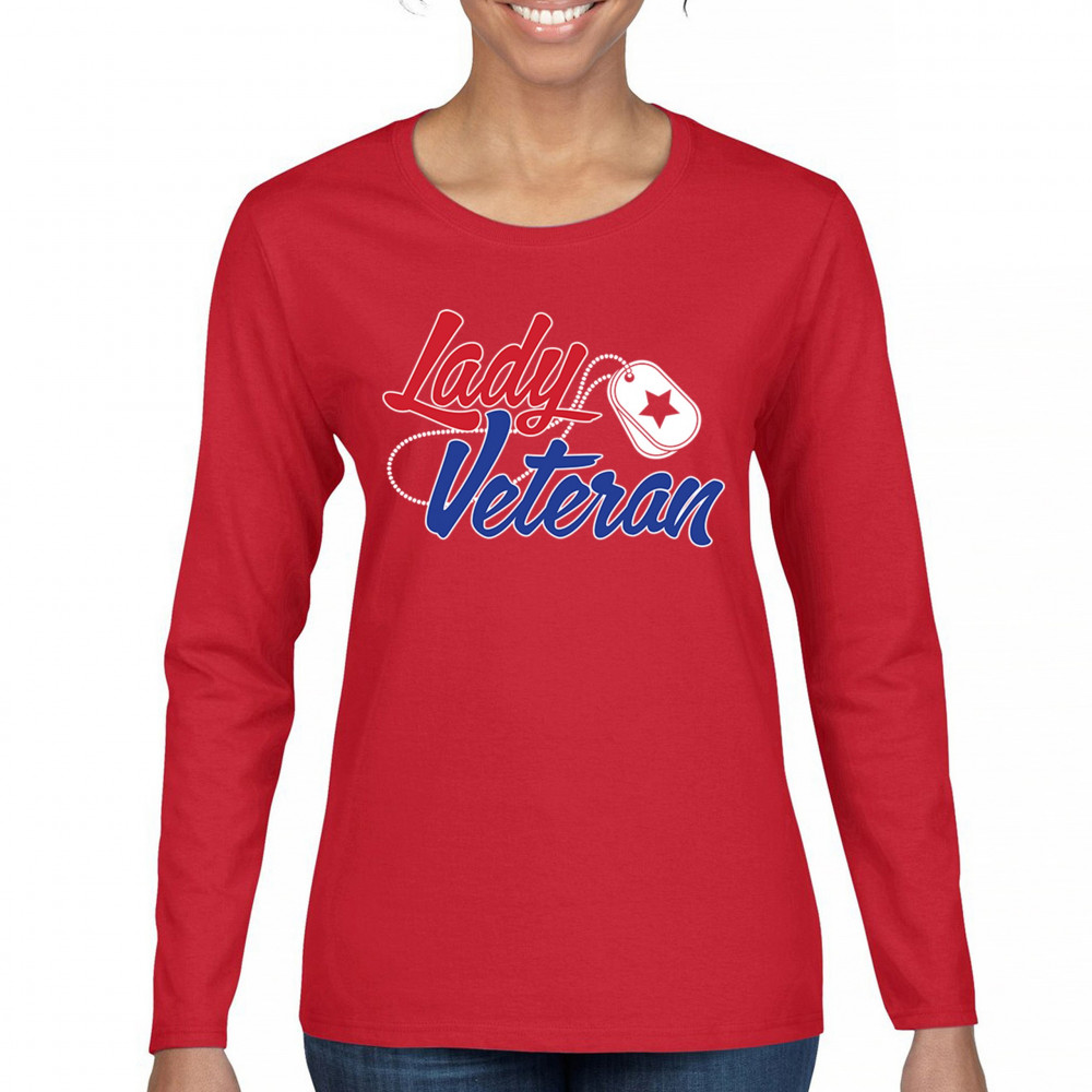 Celebrate female veterans with our "Lady Veteran" shirt. Bold red and blue design, perfect for Veterans Day and everyday wear. Honor and pride in service.
