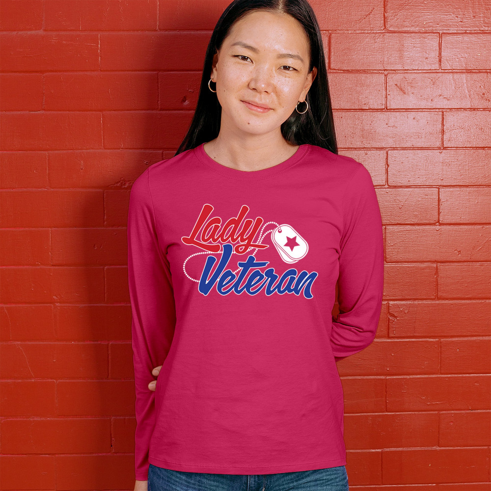 Celebrate female veterans with our "Lady Veteran" shirt. Bold red and blue design, perfect for Veterans Day and everyday wear. Honor and pride in service.