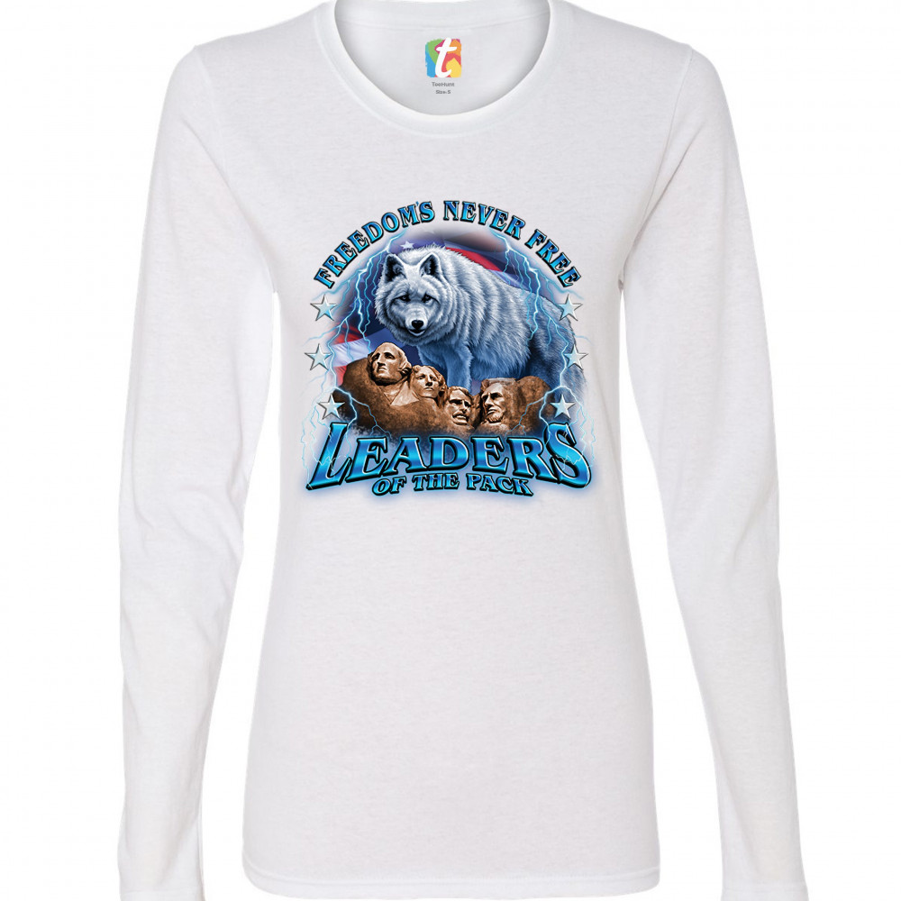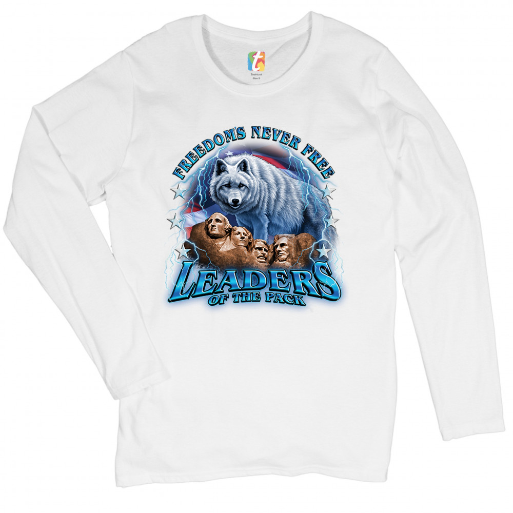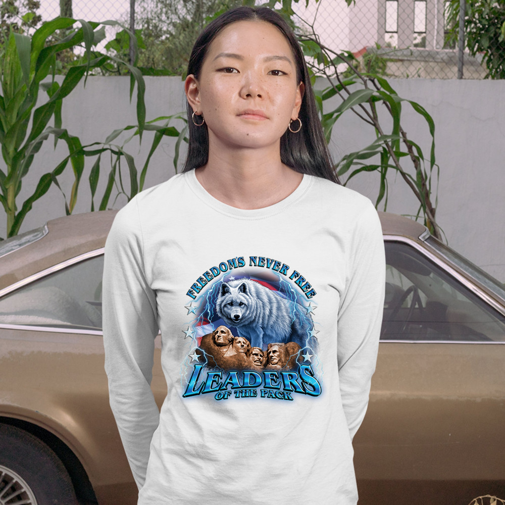A patriotic print featuring the Mount Rushmore. There is a huge white wolf with the American flag in the background and lightning strikes all over the place. The print says: "Freedom's Never Free, Leaders of the Pack". Great choice to wear on Independence