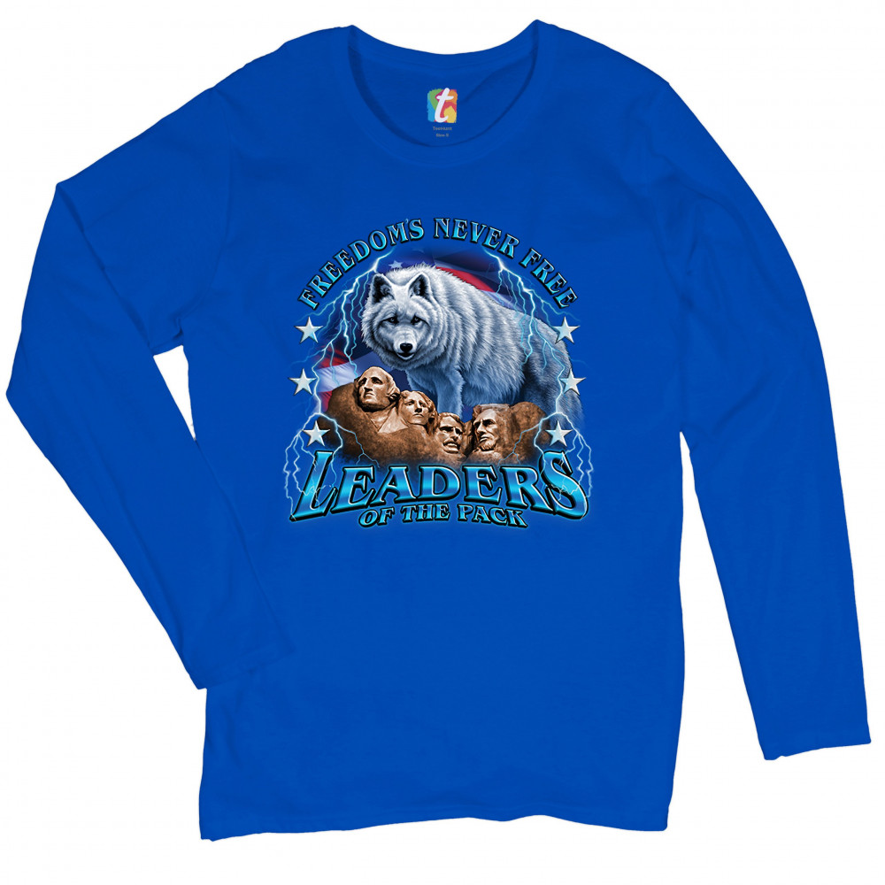 A patriotic print featuring the Mount Rushmore. There is a huge white wolf with the American flag in the background and lightning strikes all over the place. The print says: "Freedom's Never Free, Leaders of the Pack". Great choice to wear on Independence