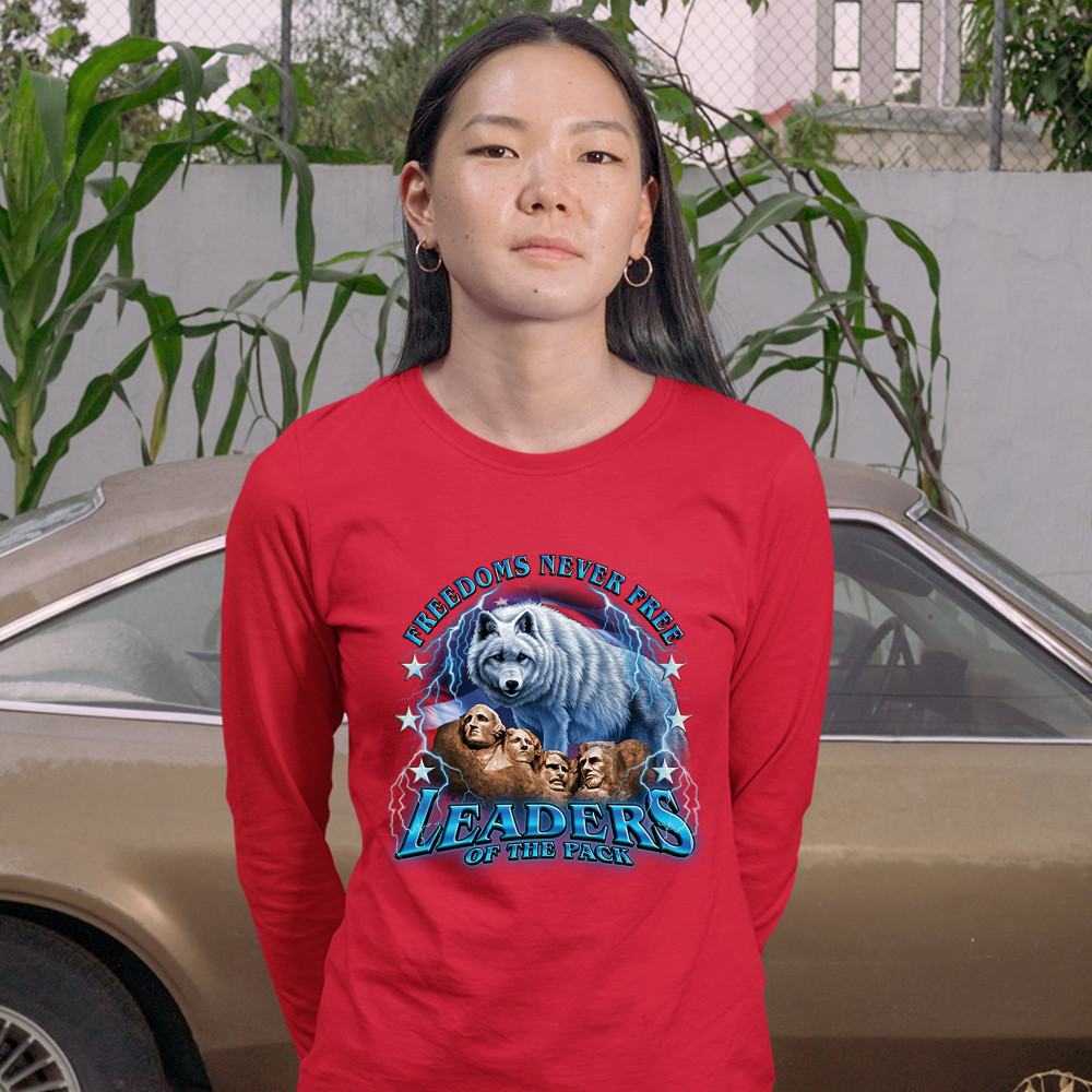 A patriotic print featuring the Mount Rushmore. There is a huge white wolf with the American flag in the background and lightning strikes all over the place. The print says: "Freedom's Never Free, Leaders of the Pack". Great choice to wear on Independence