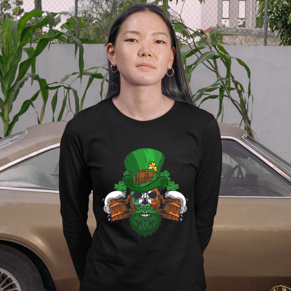 A print featuring a skull with green beard and Irish flag face. The skull is wearing a leprechaun hat. There are two beer mugs and numerous shamrocks around the skull. A great choice to wear on March 17 to celebrate the St. Patrick's Day and showcase your