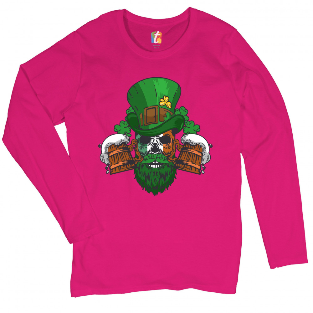 A print featuring a skull with green beard and Irish flag face. The skull is wearing a leprechaun hat. There are two beer mugs and numerous shamrocks around the skull. A great choice to wear on March 17 to celebrate the St. Patrick's Day and showcase your
