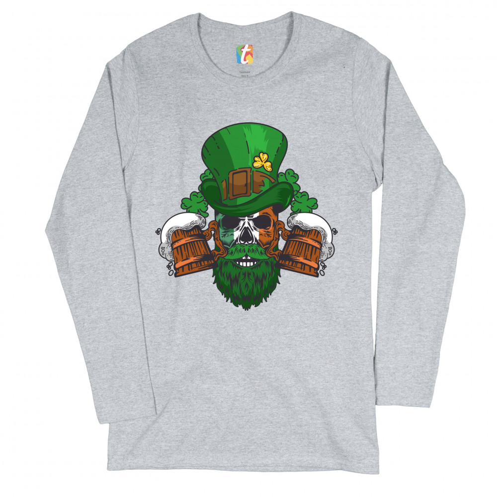 A print featuring a skull with green beard and Irish flag face. The skull is wearing a leprechaun hat. There are two beer mugs and numerous shamrocks around the skull. A great choice to wear on March 17 to celebrate the St. Patrick's Day and showcase your