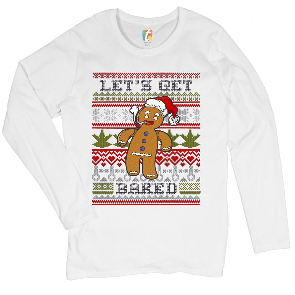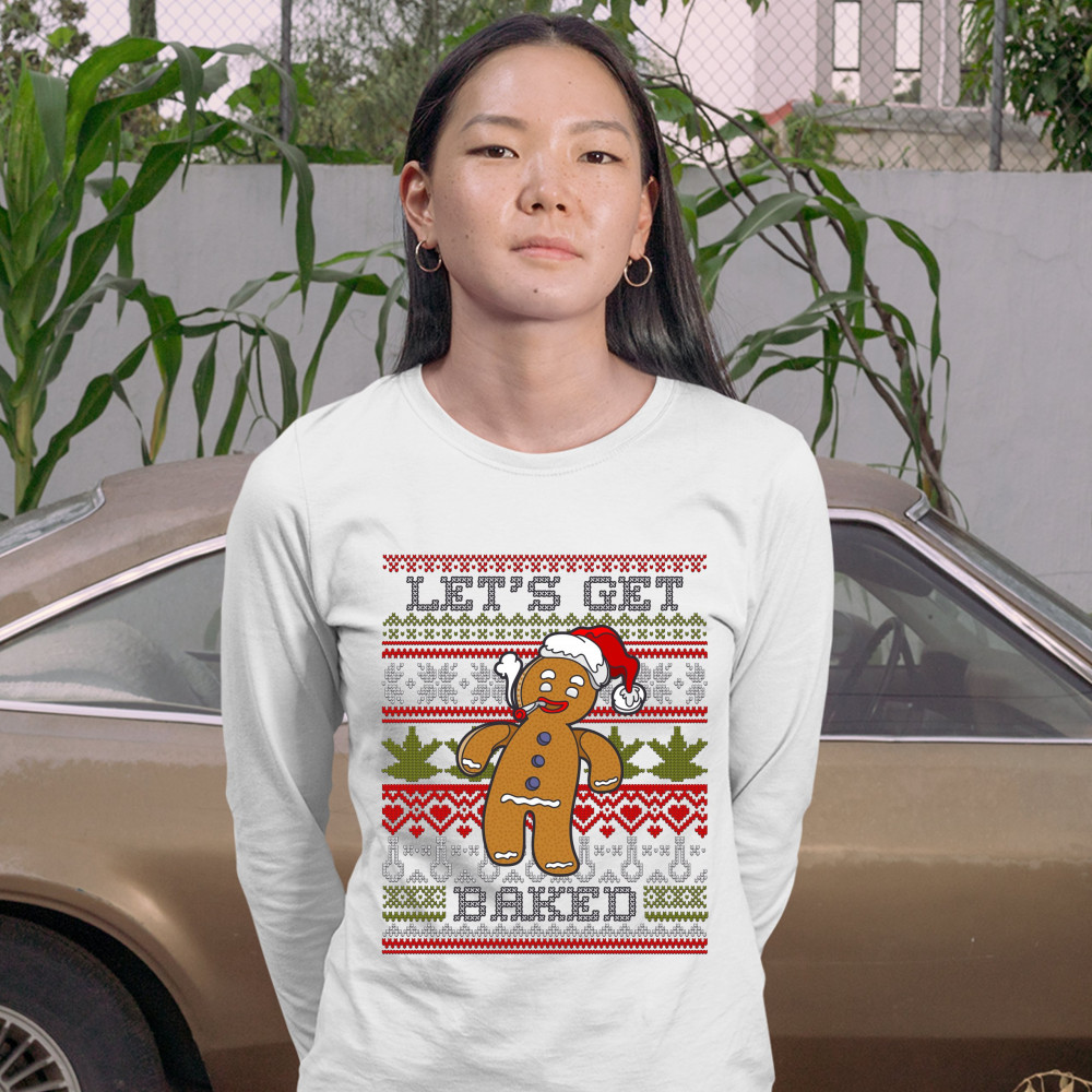 LET'S GET BAKED women's long sleeve t-shirt ugly sweater gingerbread man 420 white