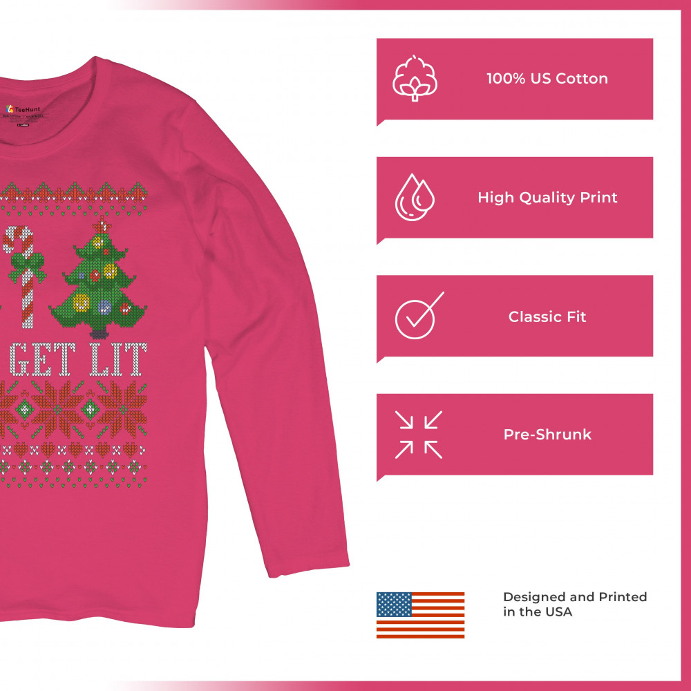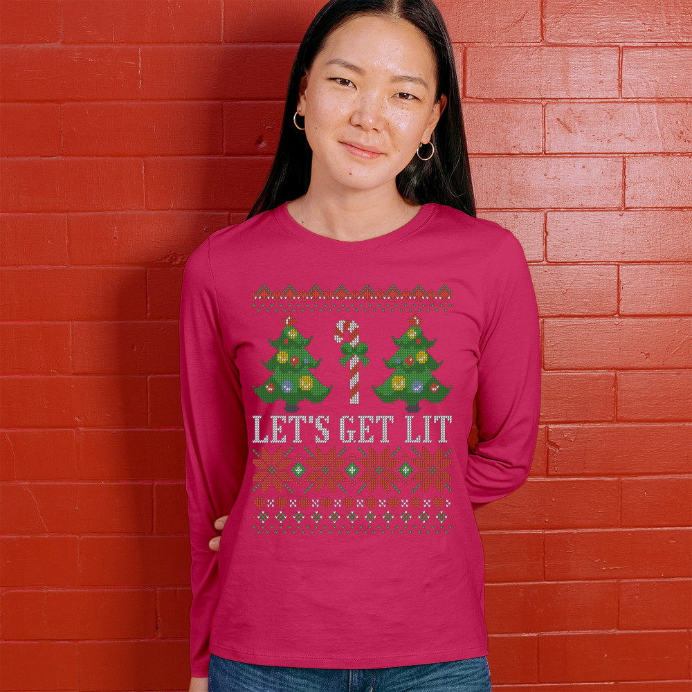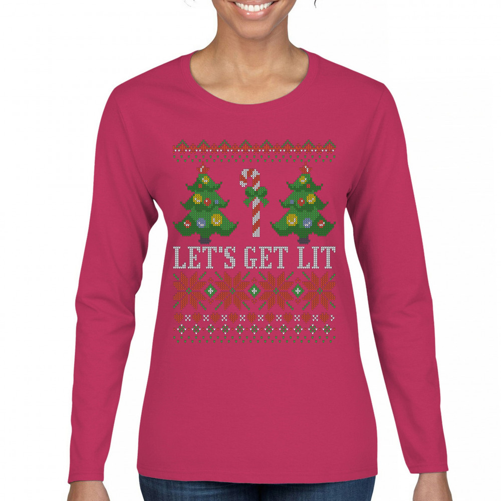 LET'S GET LIT women's long sleeve t-shirt ugly sweater christmas candy cane pink