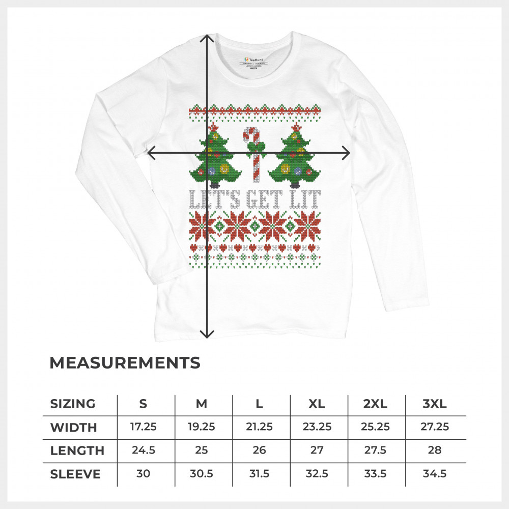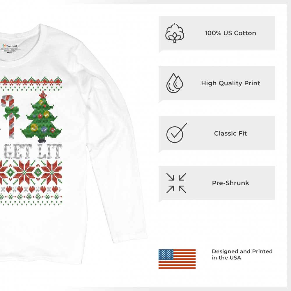 A print saying: "Let's Get Lit" and depicting two Christmas trees and a candy cane between them. The print is decorated as an ugly sweater. A great choice for a Christmas eve celebration.