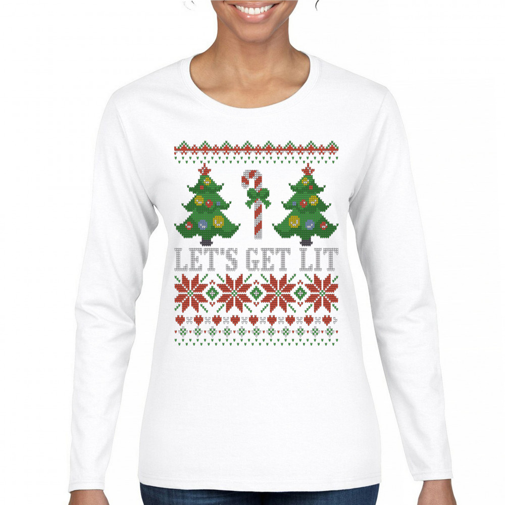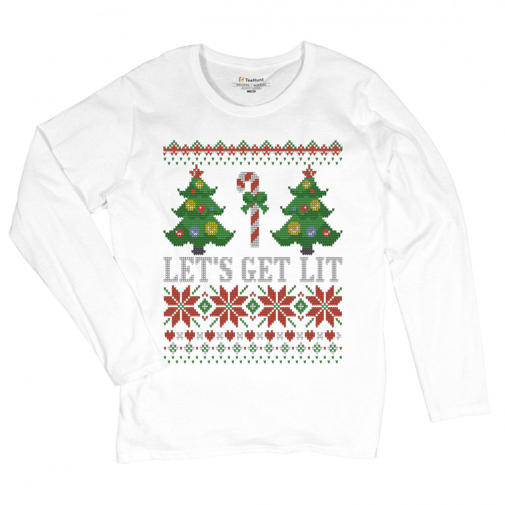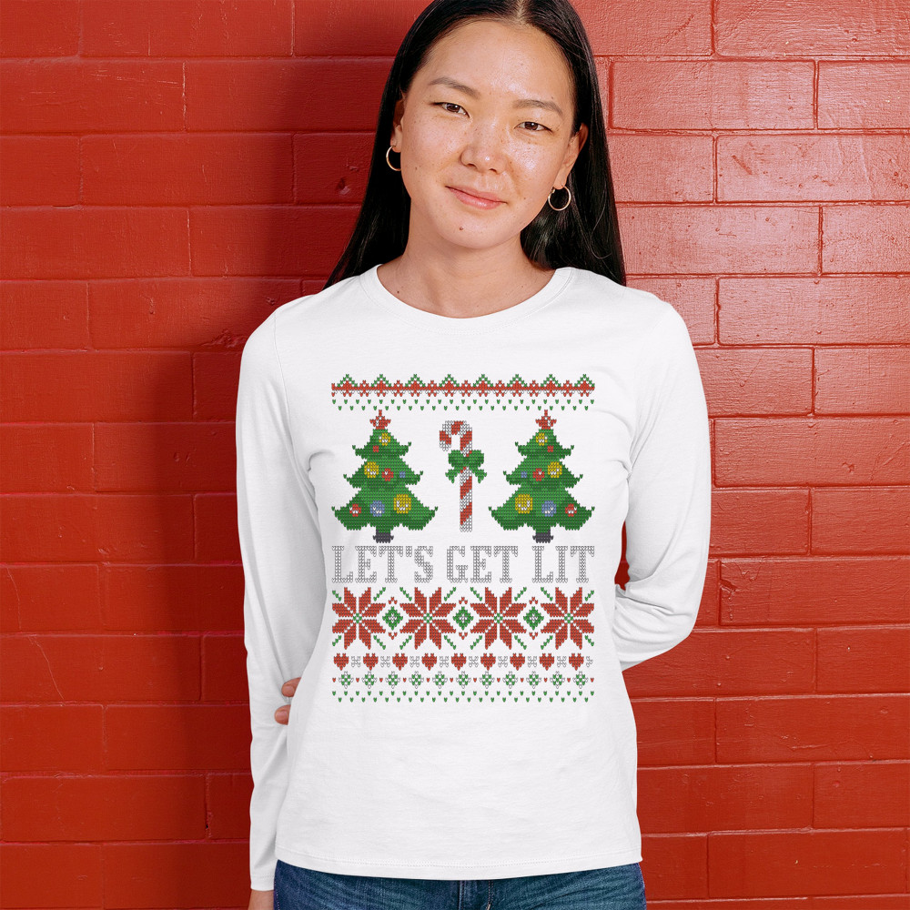 LET'S GET LIT women's long sleeve t-shirt ugly sweater christmas candy cane white
